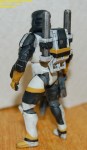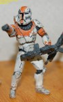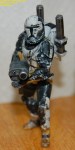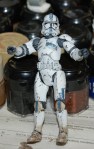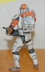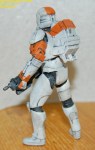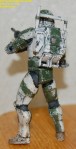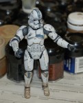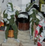 Pics 5-14: Alright, Sgt. Test-bed is just about done… the first couple pics show him with the quick and dirty Clone Trooper-esque markings I threw on, and the rest show the figure in its current state… only thing left is a coat or two of Future to seal all the paint (especially on the joints) and seal the paint to the plastic, as I still don’t know if I can trust the chemicals on the soft plastic, and as Future is an acrylic finish, it basically makes a shell over the paint that keeps it in place and prevents any reactions… after that I’ll throw on another matte coat and maybe a few metallic scratches and gloss the visor. Let me know what you guys think, as this is what I’m thinking the RC figs should basically look like… I tried to keep the Lucas-ey palette… troopers and the like have a pretty limited color palette on their armor… it doesn’t rust or streak, but it gets dinged up.