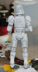 The second pair of pics show our hapless trooper after primer and a base coat… there’s a few spots to touch up with a brush, and I need to get more canned air, but this is the base color I whipped up, and made enough for all the figures I received (and maybe more). Right now the base color looks a bit dark and grey, but this allows me to build up the white color a bit and add some depth, and then I can work from there… the tonal value of the figure will change as I work through the weathering and such as well, and since I want to test all of the products I’ll be using, this first guy will get plenty beat up.
