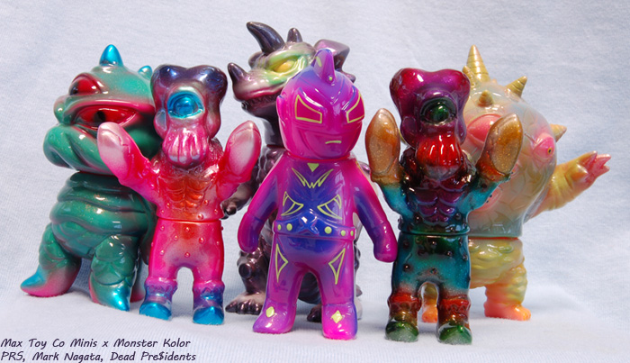 With the completion of the Eyezon, I have assembled a full set (plus a duplicate) of Monster Kolor painted Max Toy minis.  The Eyezon, metallic Xam, Tripus, Drazoran, and Eyezon are by me, the pink Xam is by Nagata, and the Maxx is by DP.  Now I need to get one of every sculpt hand-painted by a different artist 😉  I have a flat-color Drazoran painted by Gatchabert, so that’s three sculpts down…