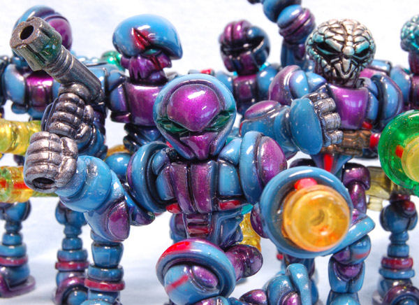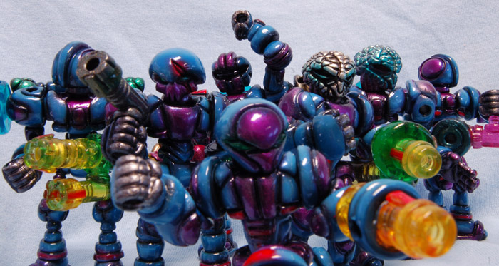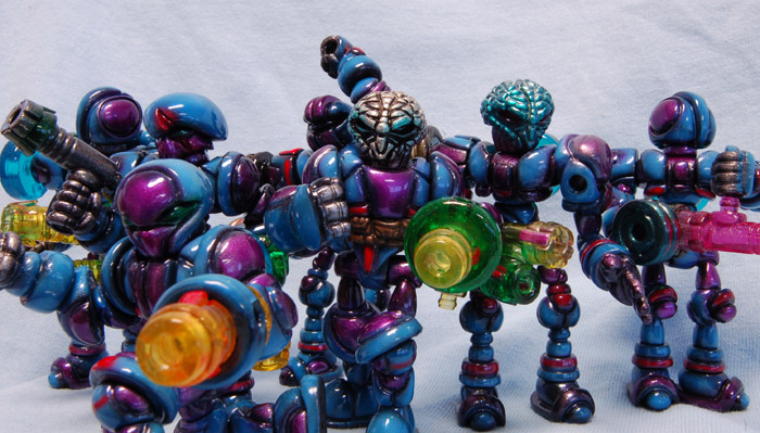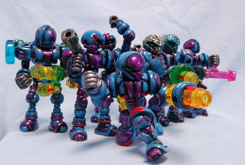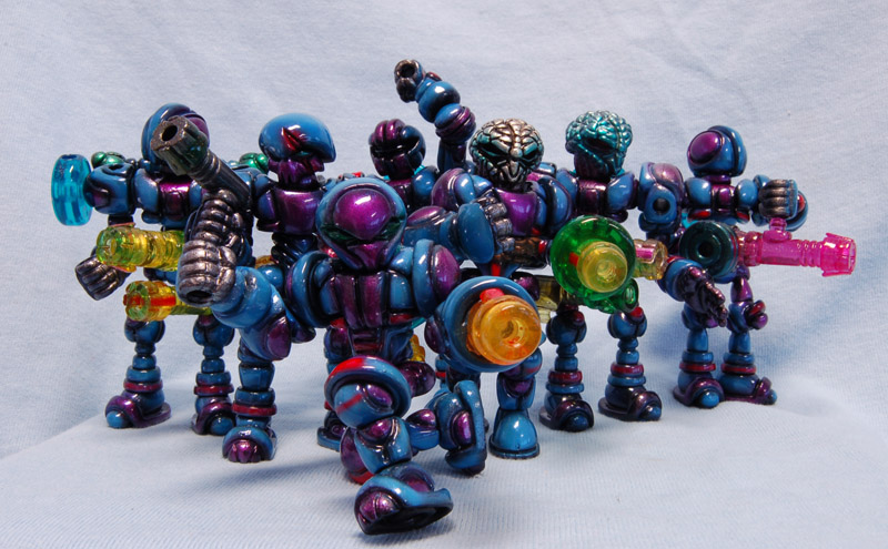 Doing a group of customs all in the same scheme like this brought me back to painting miniature armies. The scheme had to be unique, but reproducible, and subject to variation because of the different builds. I’m really happy with where it ended up, and thinks it gave them cosmic, powerful feel with an acidic color palette.
