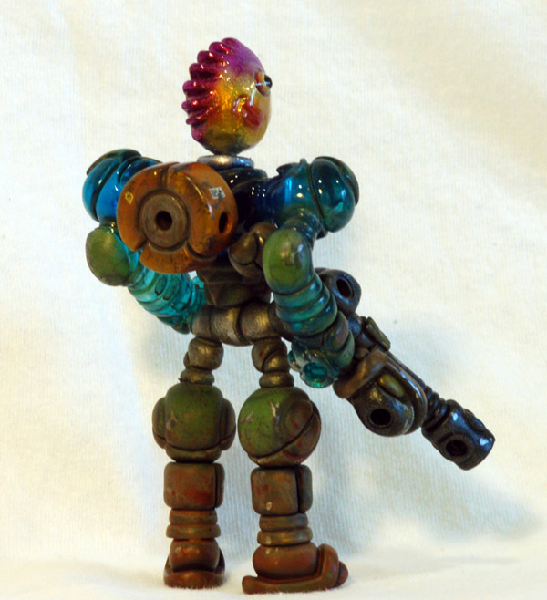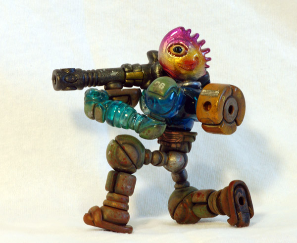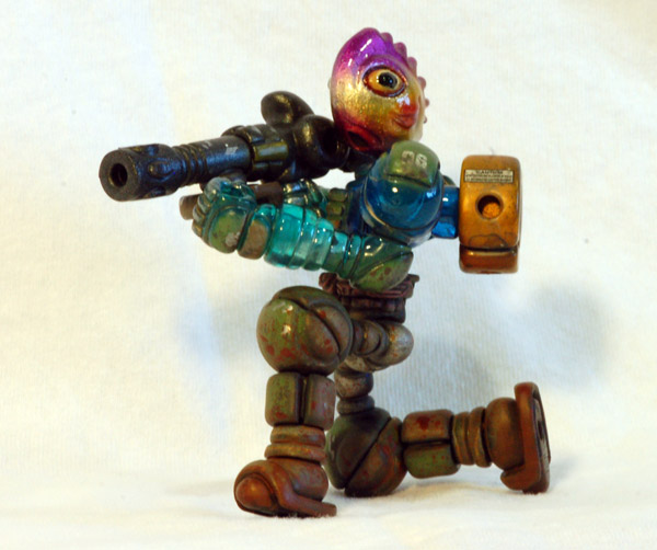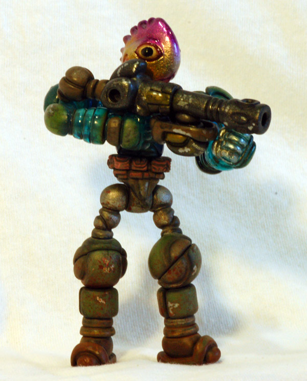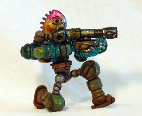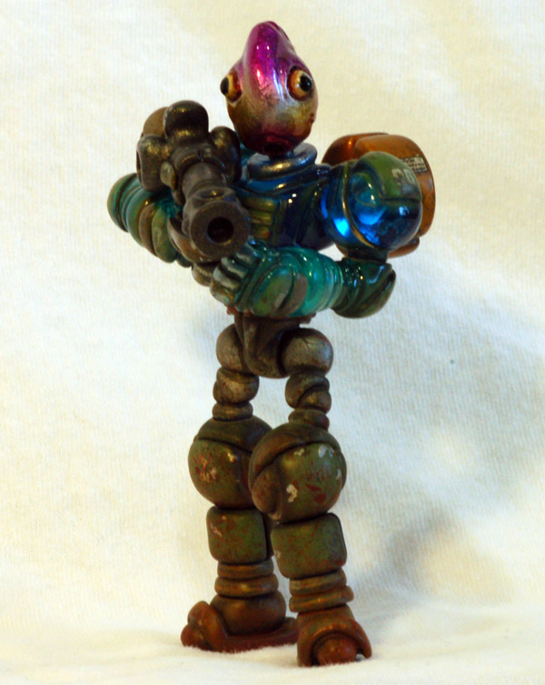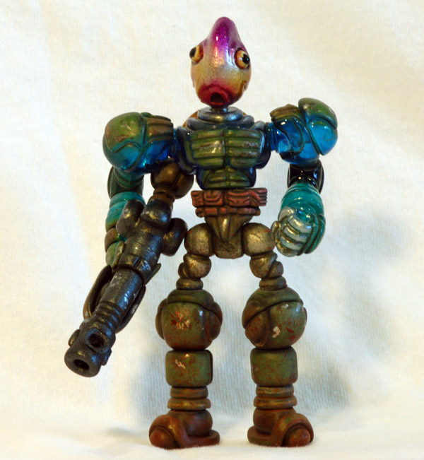 I hung onto the Aquoid head for a while brainstorming what to do with it. In a fit of inspiration I imagined how cool it would be if the fishy looking head really was the Aquoid… as in all of him. Like a fish. Then I put together what would be a bionic ‘body’ for him. The upper half is liquid-filled to keep him hydrated, with a waste-processing and powerplant on the back. The lower half is all mechanical.