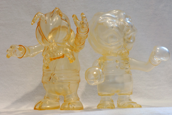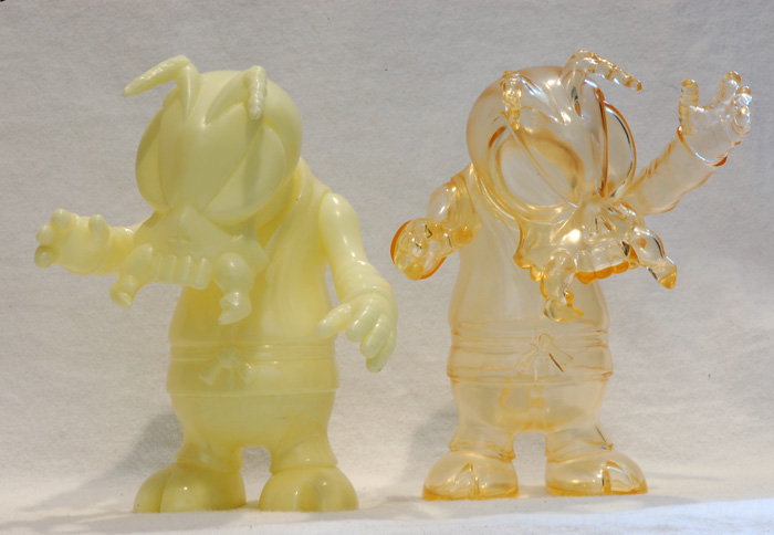 In my last box from Japan I got a bunch of Secret Base figs from a blowout sale on YJA. These three are some of the elusive Secreters, the best SB releases out there. Secreters are all Skullbrains, my favorite mold, and feature clear elements, pipecleaners, freehand sprays, and awesome homage color schemes. After the jump, enjoy some yummy unpainted vinyl.