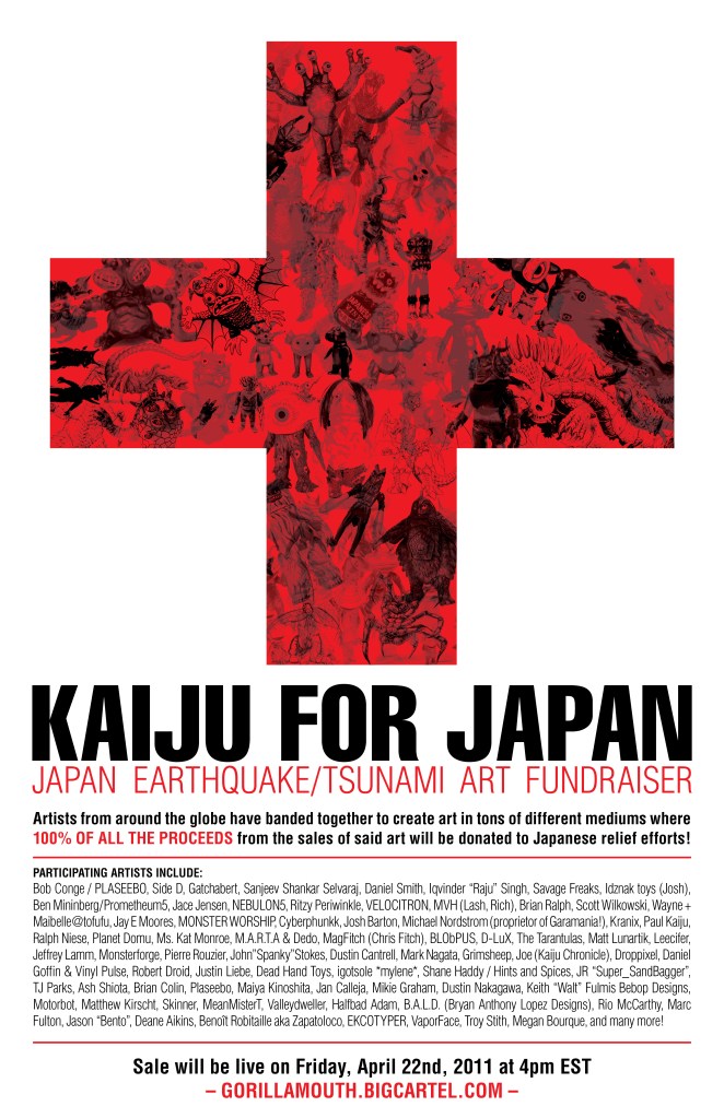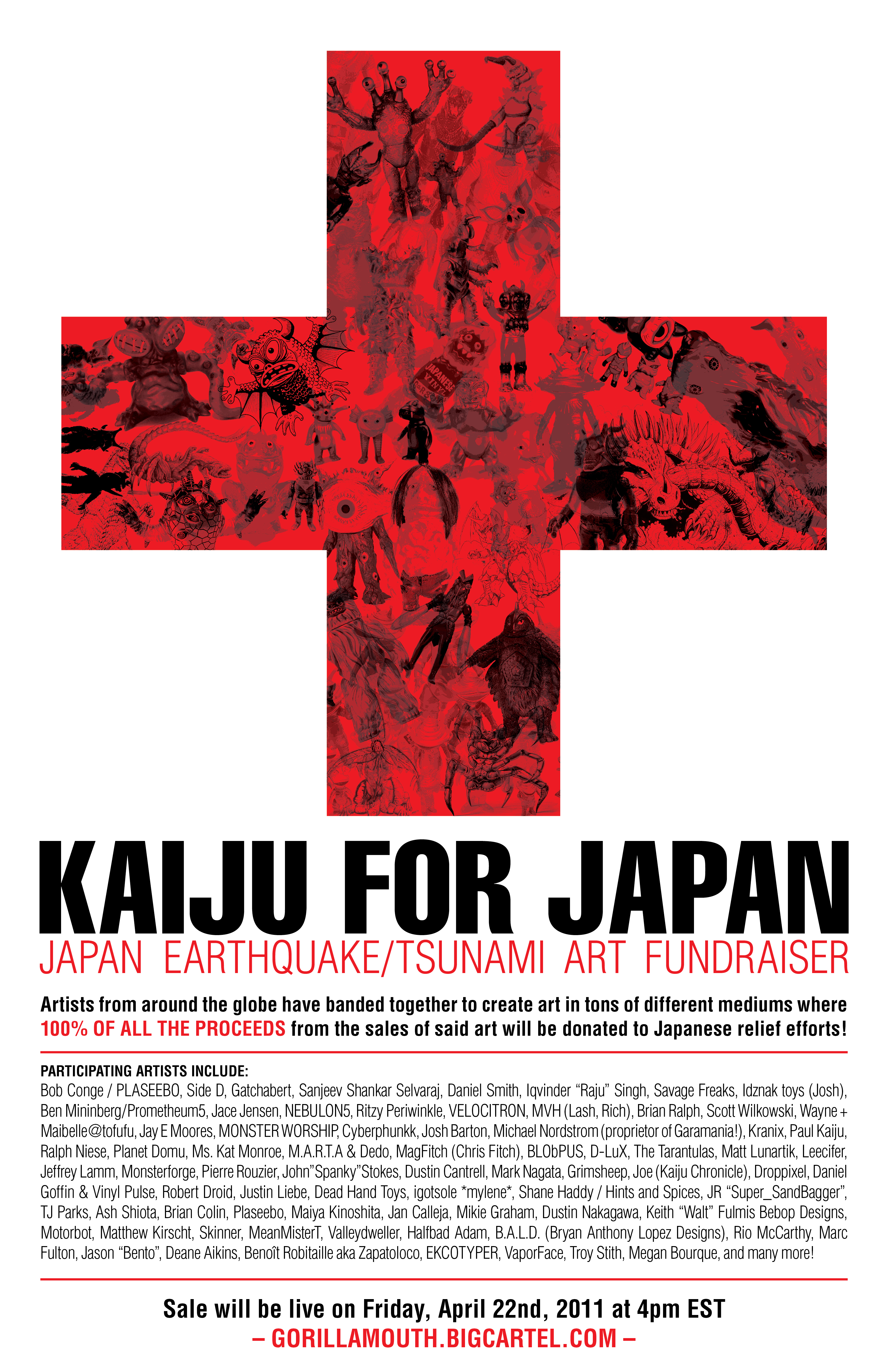 Just a reminder, the Kaiju for Japan items will be going up at 4PM EST tomorrow, April 22. Look for my Antimacrobial Microfighter, Brownnoize Productions’ Tohoku Gin Gin, Paul Kaiju’s Chibi Welts, pieces by Dustin Cantrell and Mark Nagata, and many more fantastic toys!