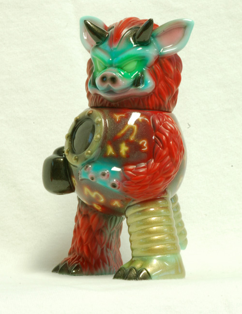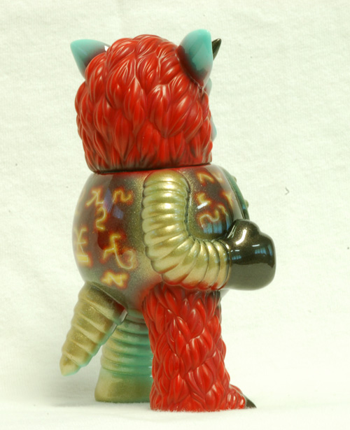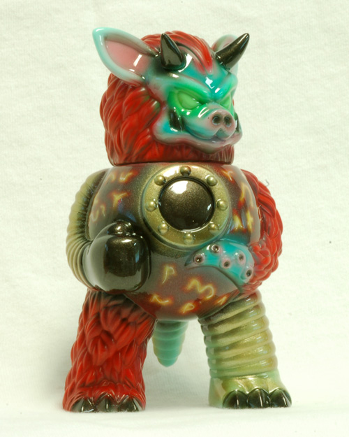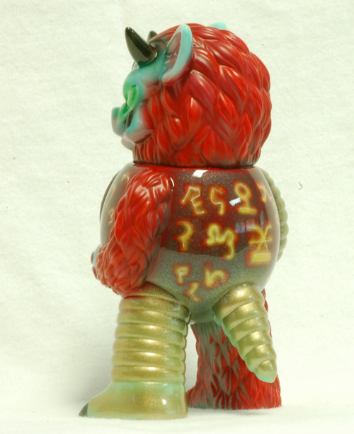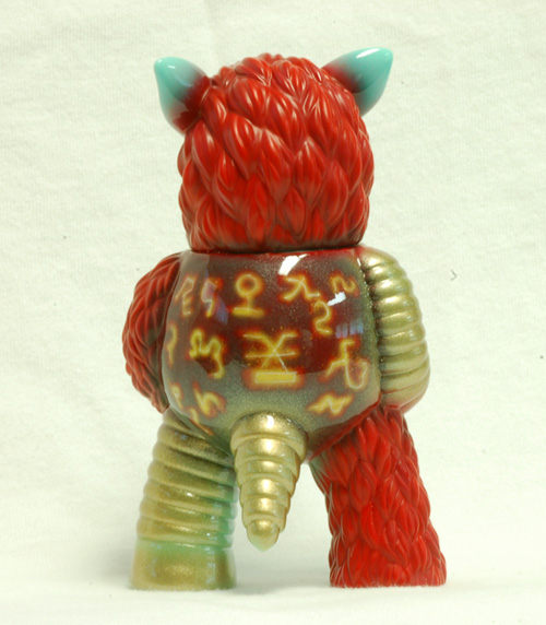 Partyball is Paul Kaiju’s contribution to the Monster Family line, and a super fun little sculpt. This custom will be at the FOE Monster Invitational Show in July. I continued my experimentation with mixed finishes and also tried something else in a fit of inspiration. I had been looking at Warhammer 40k models and was inspired to try out some more technical airbrushing to do glowing engraved symbols.