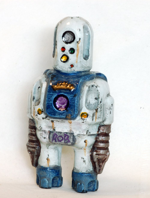 Cris Rose is a UK-based artist that is into analog photography and robots. His resin robots are functional, yet cute. There are back stories to all of his designs. Cris imagines a world where robots are ubiquitous servants, everywhere from industrial labor to childcare. I had a great time painting up a pack of his recent Bits and Bytes mini-sized (1/24 scale) DIY ‘bots, each with their own background. Keep in mind each of these minis is around an inch tall, and check after the fold for pics of each!