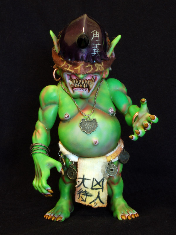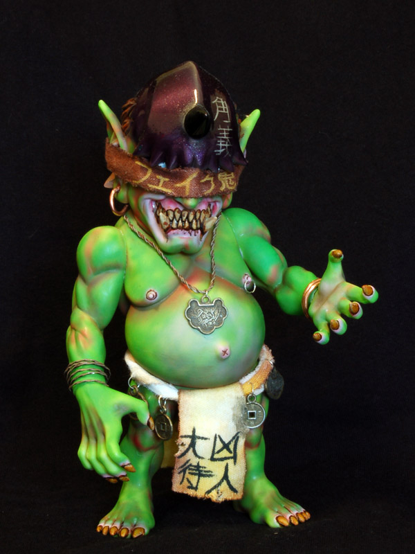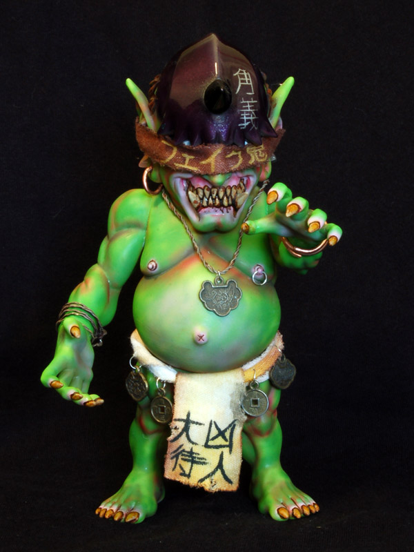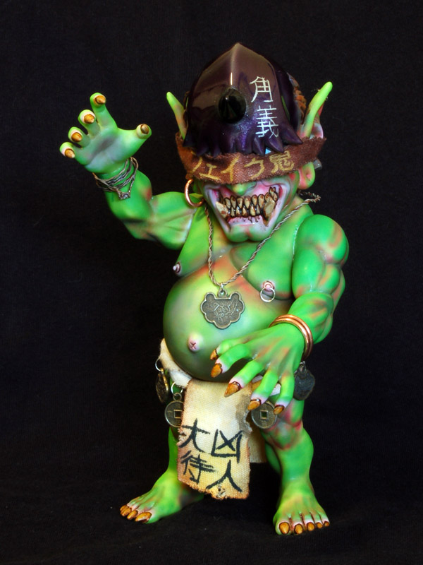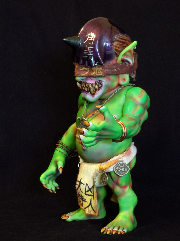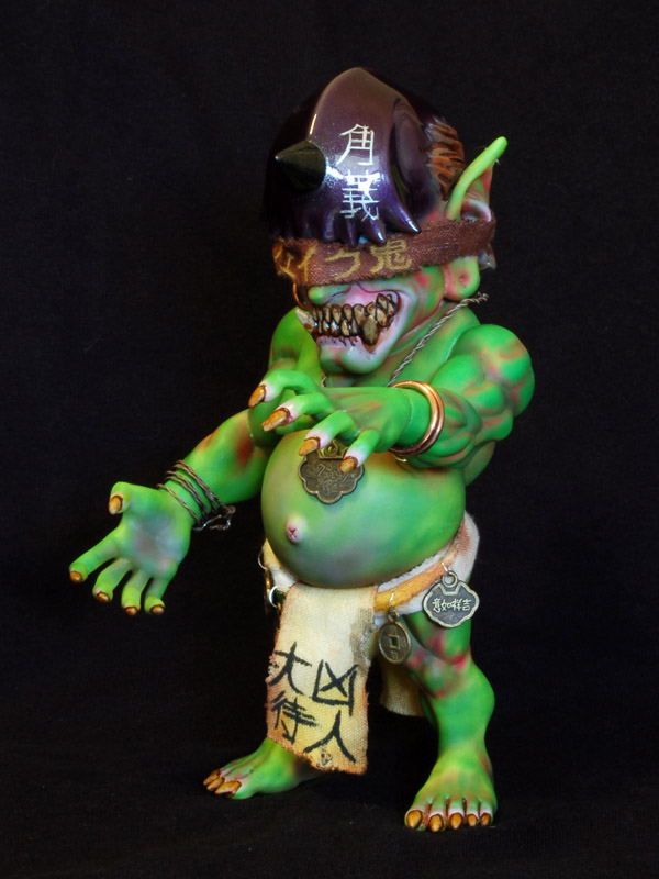 This Oni was born blind and hornless, and named Gikaku (フェイク鬼- ‘false Oni’). He was too embarrassing to keep after waiting so long for his birth, so a prosthetic horn (義角) was fused to his head and he was cast out. Now, Gikaku travels alone, appearing only in place of a person being expected. To see Gikaku is a terrible curse, and he is greatly feared. The fundoshi reads ‘Great curse (dai-kyō, 大凶)’ and ‘待人 (machibito) – a person being waited for’, based on Omikuji fortune terms.