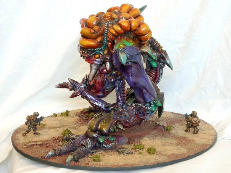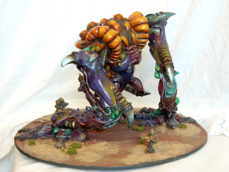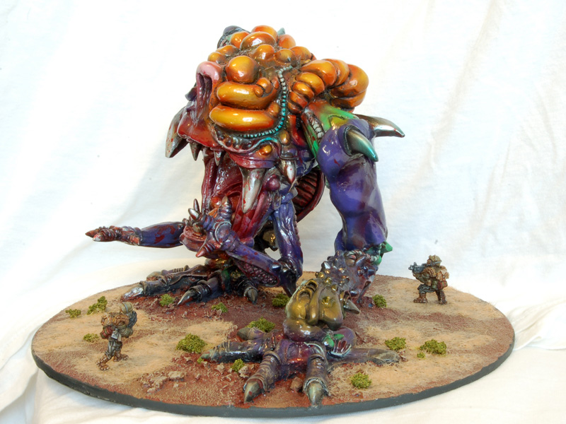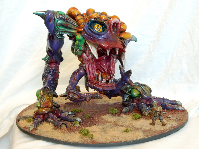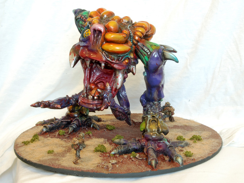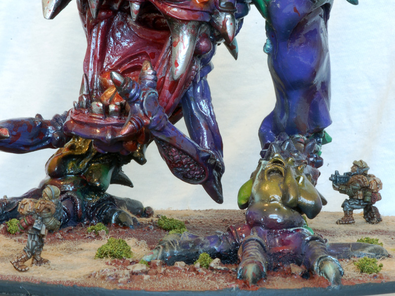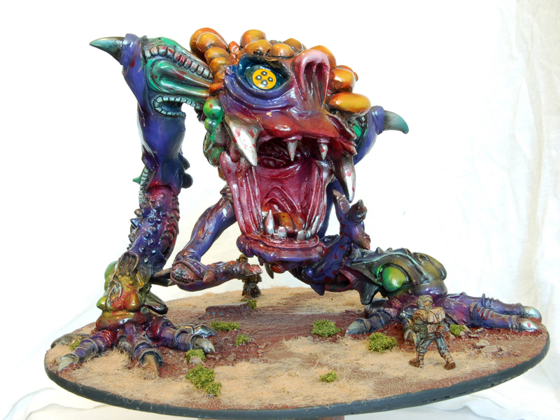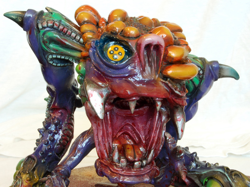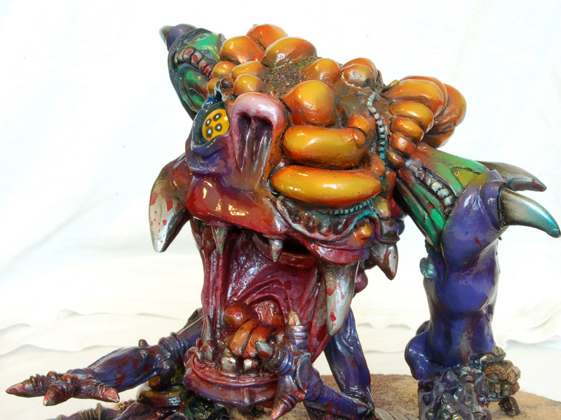 There is a lot of interesting and varied detail scattered around the huge model, and it took my wildly-colored sprays like a champ. The Kaos Monster is the result of some terrible experimentation, and it looks like it is barely maintaining its form as it attacks. The combination of harder looking armor parts and soft, squishy bits made for the perfect canvas to mate some pearly Monster Kolor goodness with a more traditional miniature painting approach.