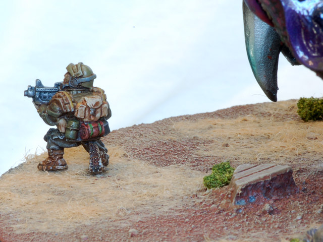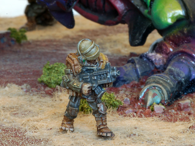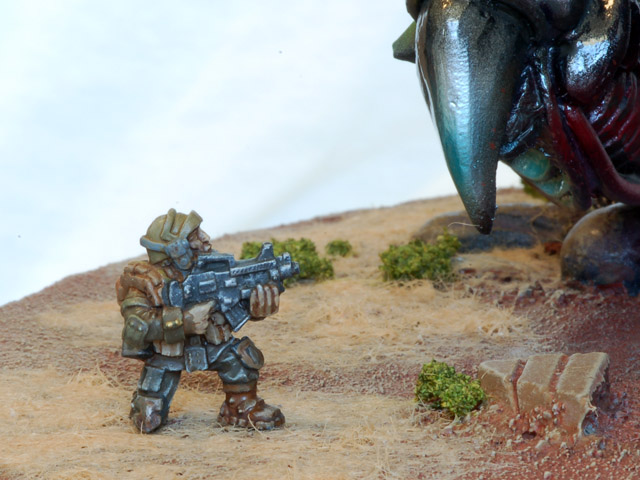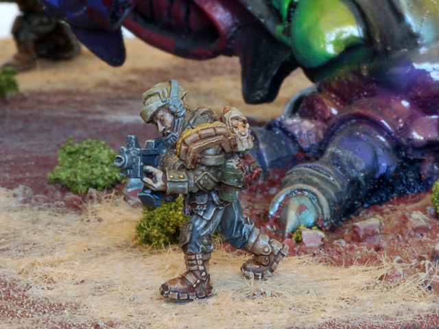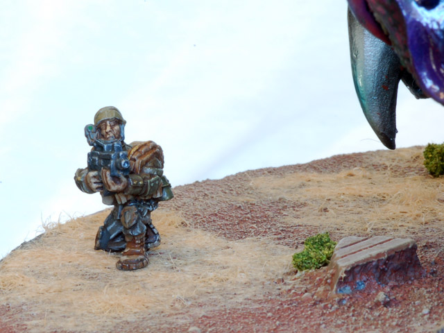 The almost certainly doomed troopers are Union Troopers from the long out of print Vor. Kaiju Kaos actually makes a modular metal soldier mini that looks pretty good, but I have a big stash of Union guys to dip into. They are pinned to the base but not glued.