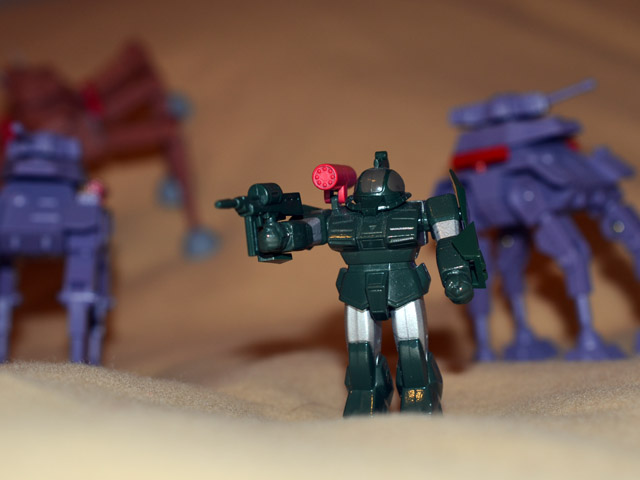 Fang of the Sun Dougram is one of my favorite mecha series, and the old toys are fantastic. The 1/144 series manages to strike a great balance of diecast, solid construction, and sharp details into a small size that allows for army building and some nice Real Robot diorama action. Here’s an Earth Federation patrol on maneuvers in the desert.