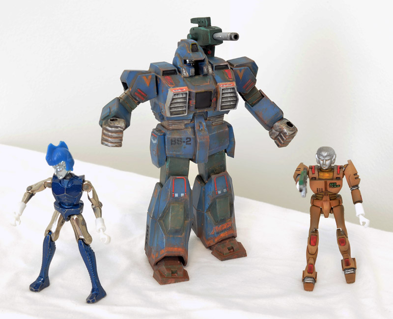 The box includes the Bio Mechanic Suit and a Hyper Microman that has to be assembled as well.  I painted the Microman up as a test-type support personnel for the suit, and threw a beater Micronaut (gasp!) in as the pilot so that I wouldn’t chip the Hyper Microman trying to insert him.  The silver gun barrel is actually a missile that figures.  I lost the original spring from the kit and had to fit a pen spring in there, so now it figures really,  really hard.