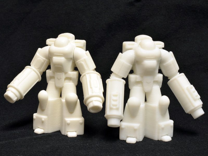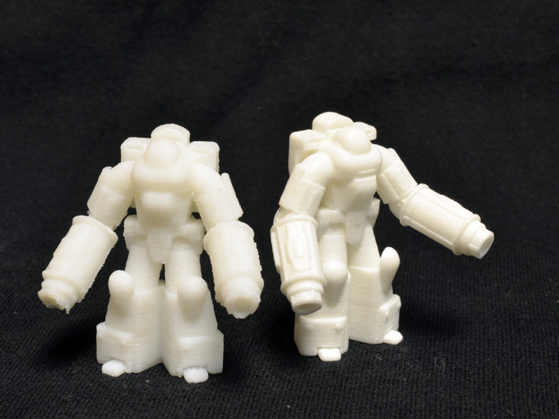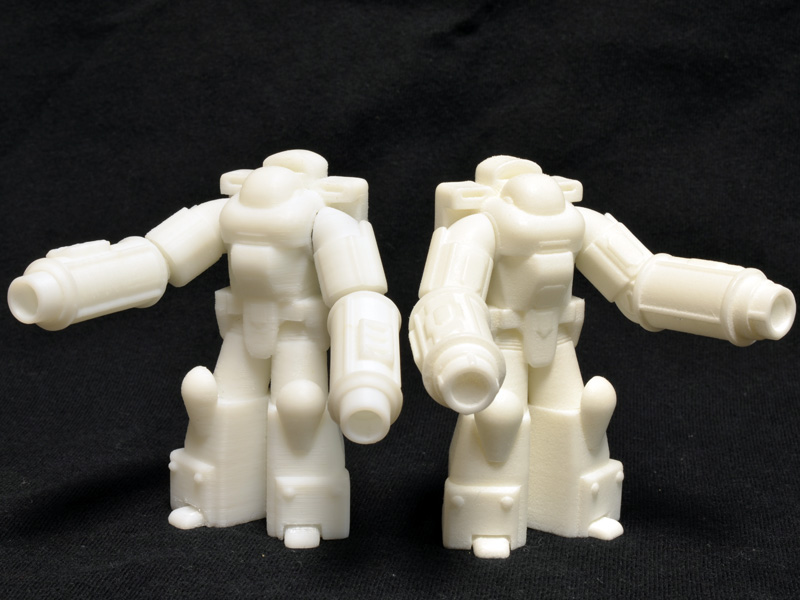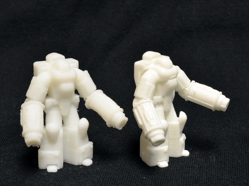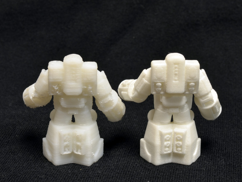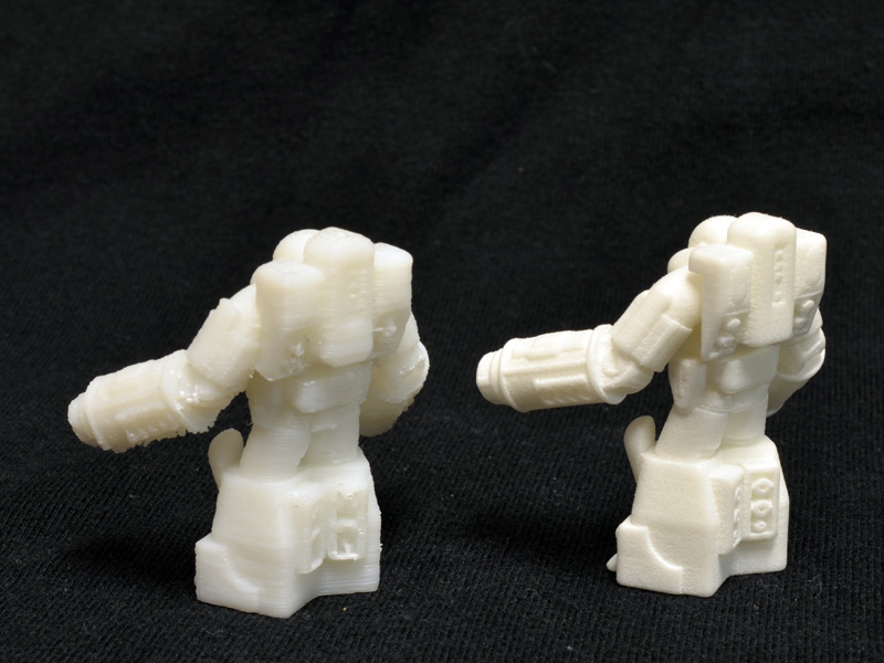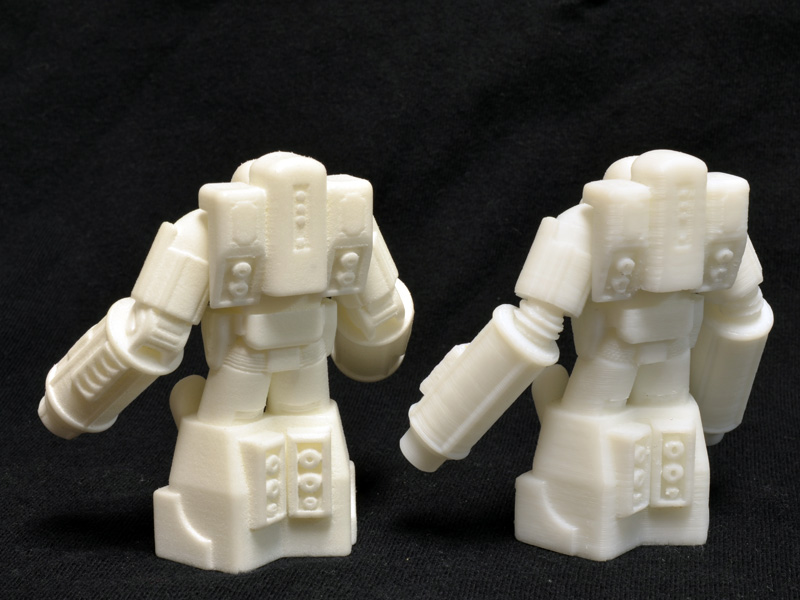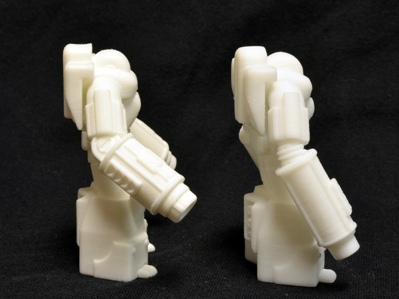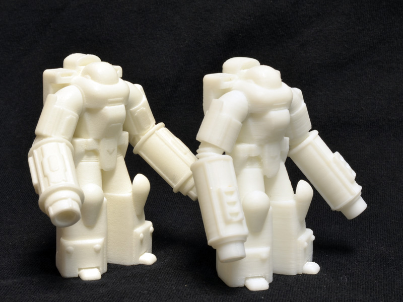 Comparing my 1/60 print to the print I received from Shapeways demonstrates the nice resolution of Shapeways’ laser sintered nylon. Even on a one inch figure, the detail is sharp on the Shapeways print, but a bit gummy and sloppy on my print. There is a lot I could do, though, to improve the quality of the small print on my printer, but this guy was just an initial test.