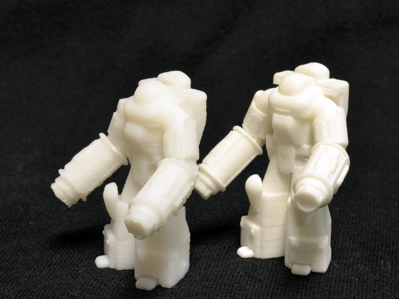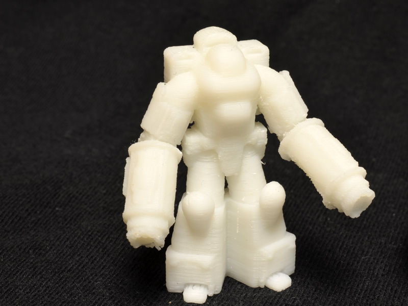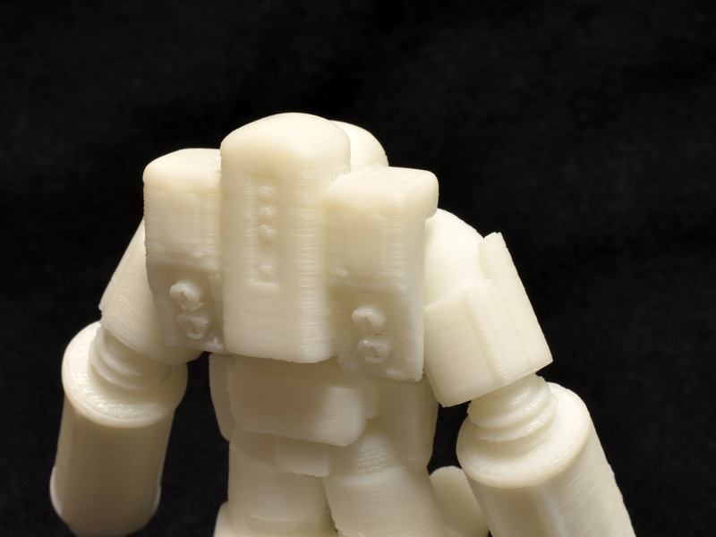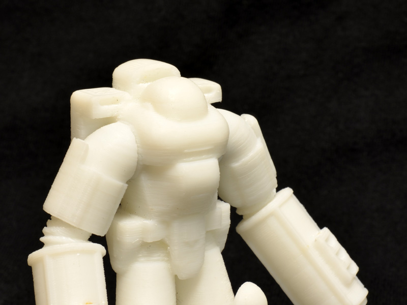 The detail is tough to make out in the photos, but the UP! print is quire comparable to the Shapeways print. There are a few fine details that did not really render, but most of the geometry is there. The ABS plastic is also much easier to clean up than Shapeways’ nylon. Sanding out the most offensive of the layering is a cinch with ABS. The other great thing about the Mini-printed figure is that it took around four hours to print the parts, as opposed to the month-long turnaround time on the Shapeways print.