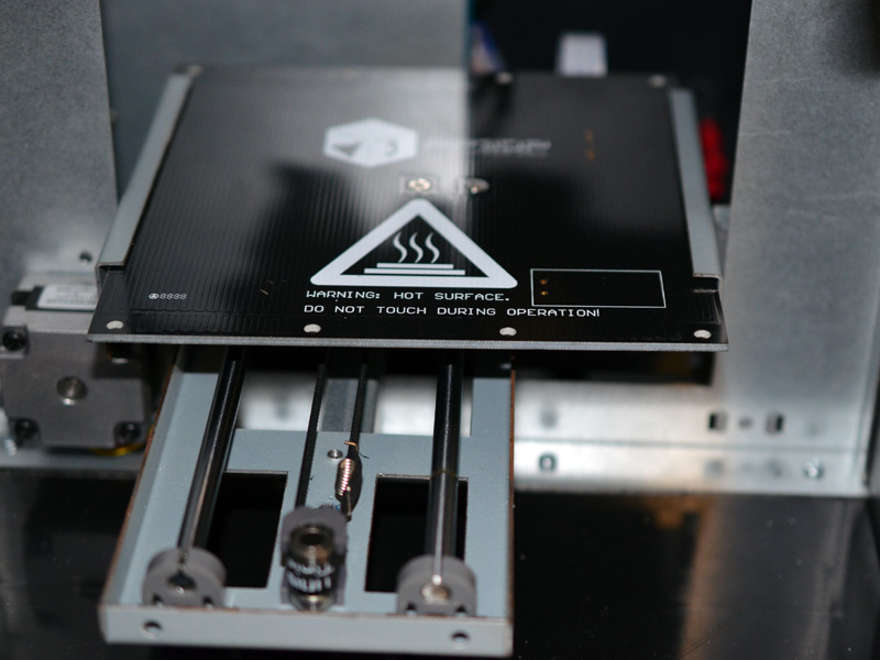 The Mini also features a fully heater print platform. The black part pictured above is the heating element, and then a piece of perforated board is slid into the brackets on either side of the build platform. The Z-axis must be configured during initialization of the printer for the first time, which calibrates the minimum distance of the platform from the print nozzle. The platform level calibration is done via the included UP! software, which is surprisingly easy to use.