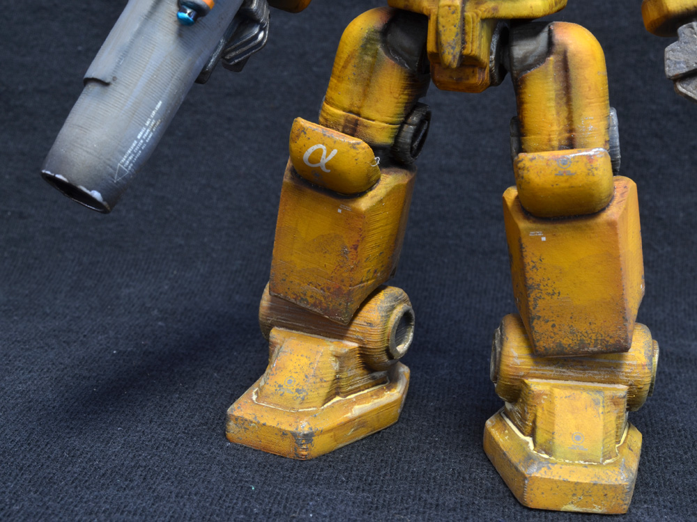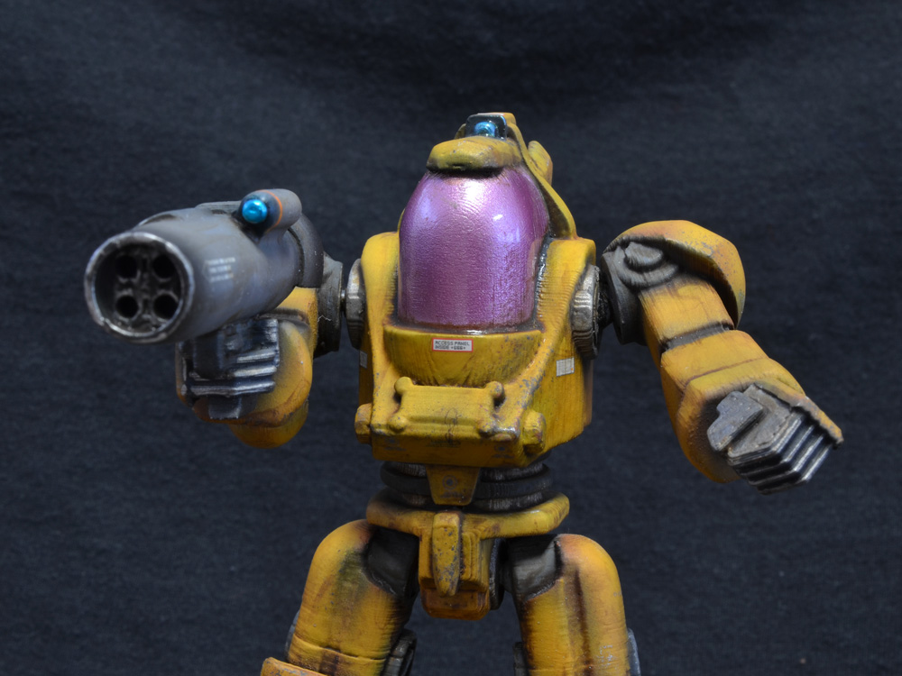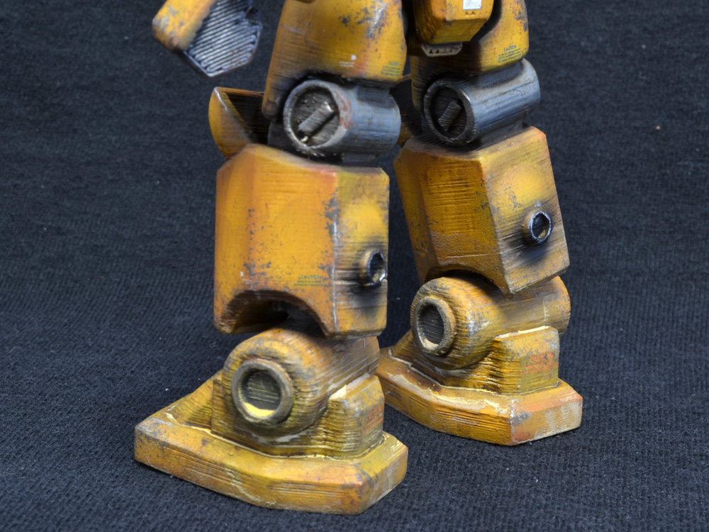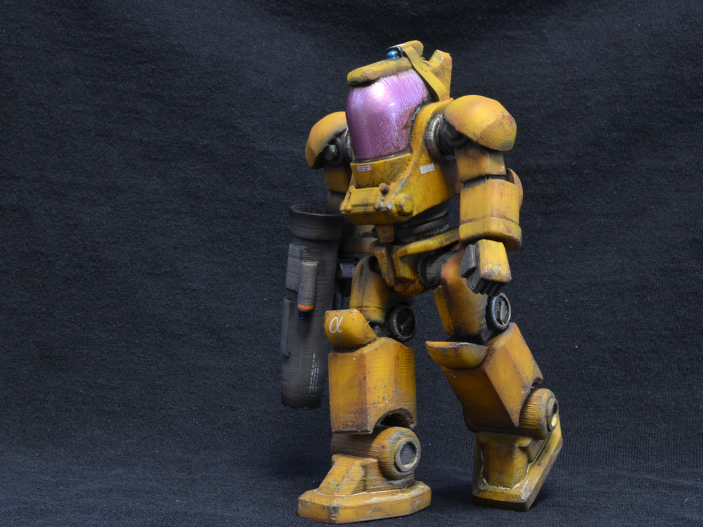 Allover-101 was the first prototype of the Allover power suit design, featuring a lightweight rocket pod. It has a one-part torso designed to be printed lying on its back. The problem with this plan is that the bottom surfaces of parts end up with an odd texture, especially with irregular parts. The Allover-102 features a two-part torso split at the waist so that both parts can be printed upright, improving detail and finish but also increasing support material requirements. The Allovers were not ready for production by the time of Prometheus Rising Heavy Industry’s debut at FOE due to a problem with the ball joint parts I had intended to use. The design has since been revised to use a superior product that makes for a more robust figure and requires less complex cutouts on the figure. Once I receive my stock of parts, Allover production can commence. Allover-101 is on display at FOE Gallery’s Rise of the Robots Show.