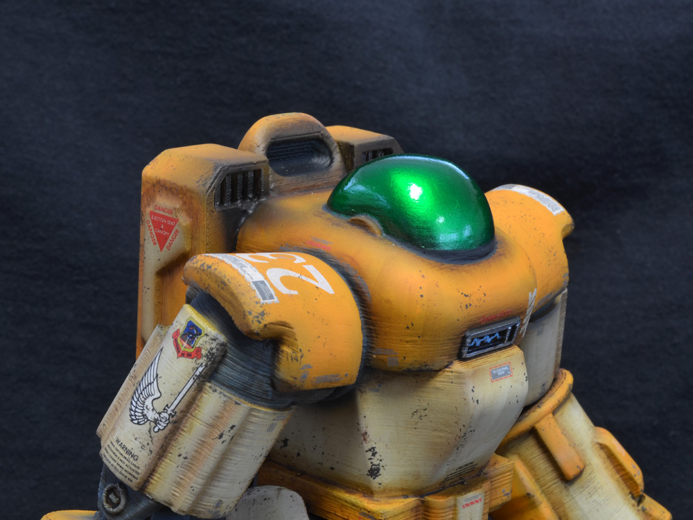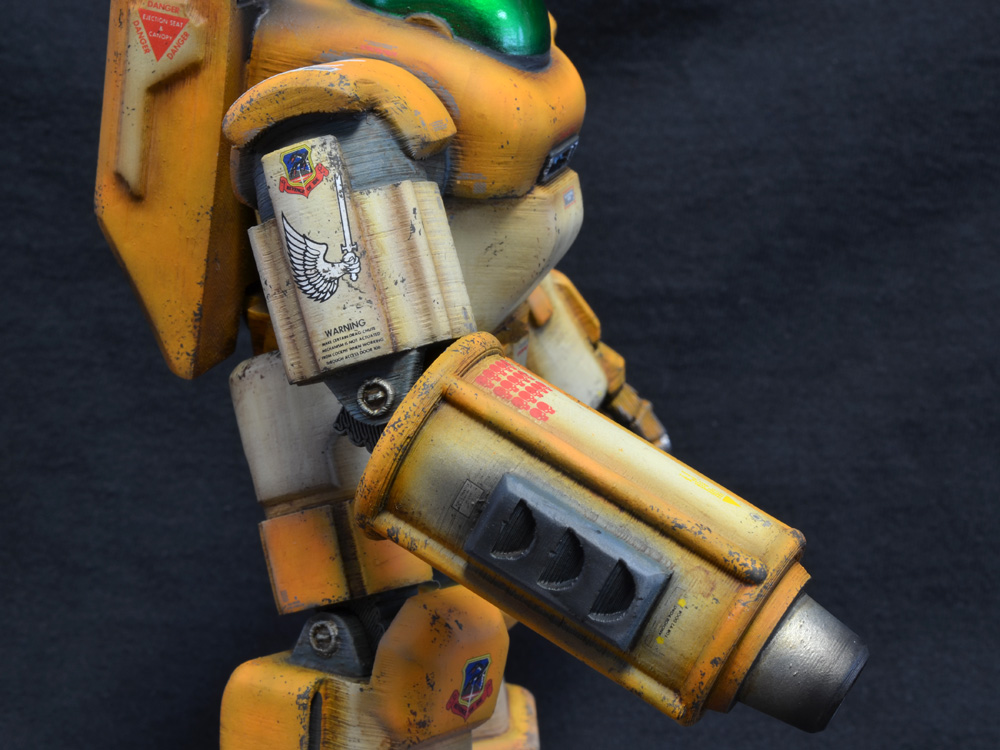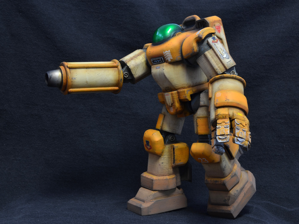 For the Heavy Industries line’s debut at FOE, I wanted to run the range of finishes, so I needed a mostly clean 1/12 Bounce Tortoise in something other than green or military drab. A quick look at my shelves revealed the perfect color combination from one of my favorite franchises, Macross. Funky test-type tan and orange combines mecha legitimacy with sci-fi weirdness in just the right way. The Ostrich version Bounce Tortoise is on display and for sale at FOE Gallery’s Rise of the Robots Show.