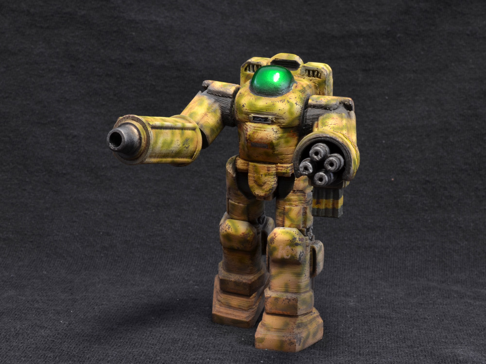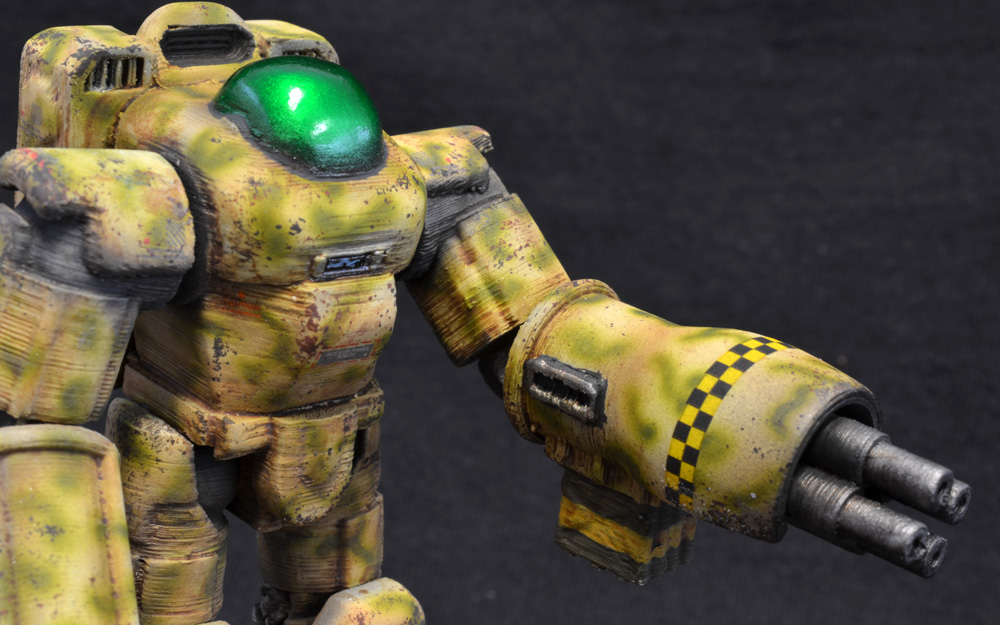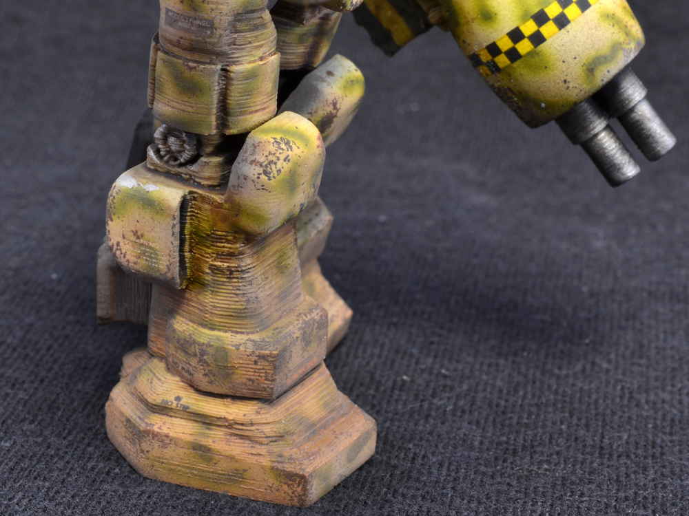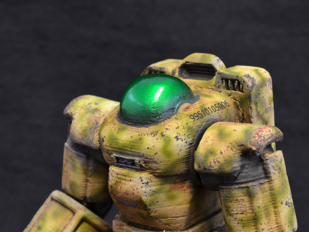 The 1/24 scale Bounce Tortoise stands around four inches tall and features swivel joints at the shoulders and hips. It is the ‘Kenner Star Wars’ figure of the line, featuring simple construction with plenty of detail that fits in your coat pocket. This Tortoise is painted as a nod to my historical armor modeling with a mottled two-tone camo and more subtle weathering. It’s currently on display and available for sale at FOE Gallery’s Rise of the Robots Show.