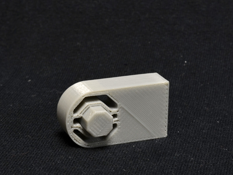 The hexagonal peg fits into a matching hole. The female part is printed lying flat on the printer bed, so the grain of the plastic works with the design to form a springy socket. ABS is slightly flexible, so the socket flexes as the peg is rotated, making a gloriously clicky detented joint!