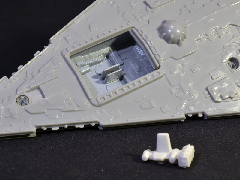 After taking myriad measurements of the original, I modeled the part on my computer and printed a rough test in ABS plastic on my UP Mini 3D printer. The detail is rough, but the ABS test part fit perfectly in the Star Destroyer’s hangar.