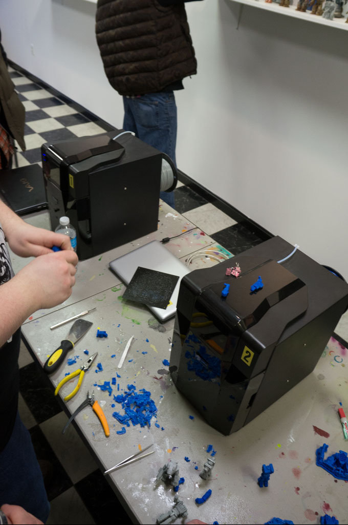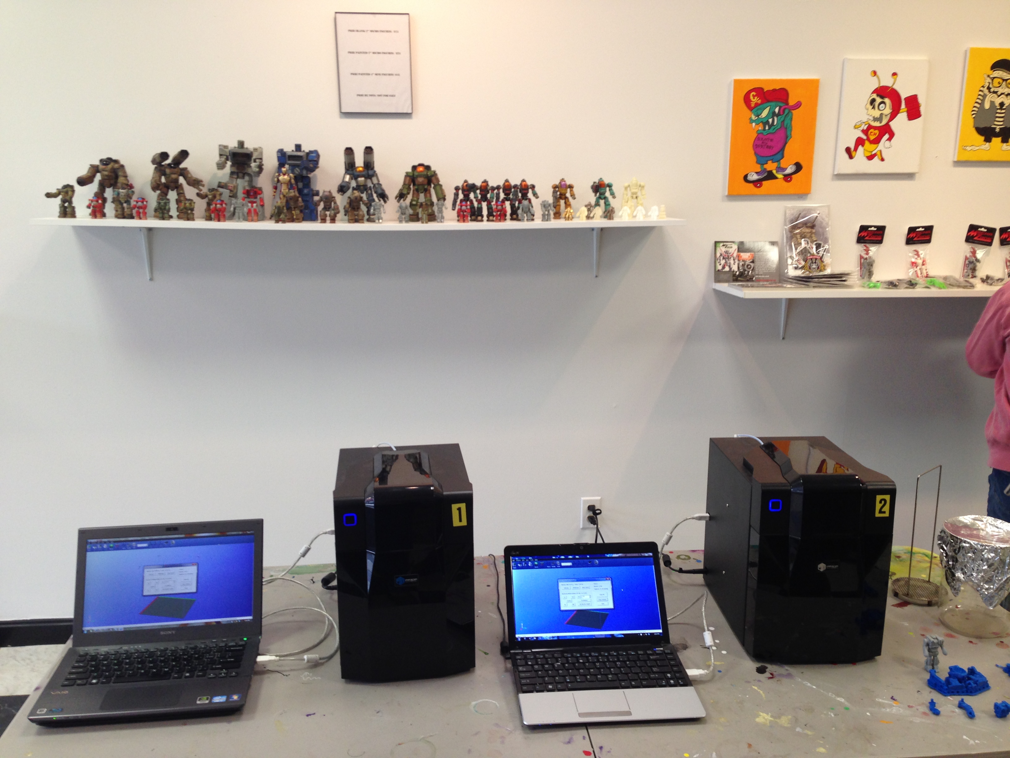 Participants got to pick their designs, printed in different colors by each artist, and have the toy made while they wait. Once we got the printers running, we walked everyone through our backgrounds and toy making processes. We discussed the software used to model, the process of designing models for 3D printing, our experiences with owning and operating 3D printers, and our inspirations for the toys we have designed. Here you can see Prometheus Rising Heavy Industries Units 1 and 2 warming up and preparing to print.