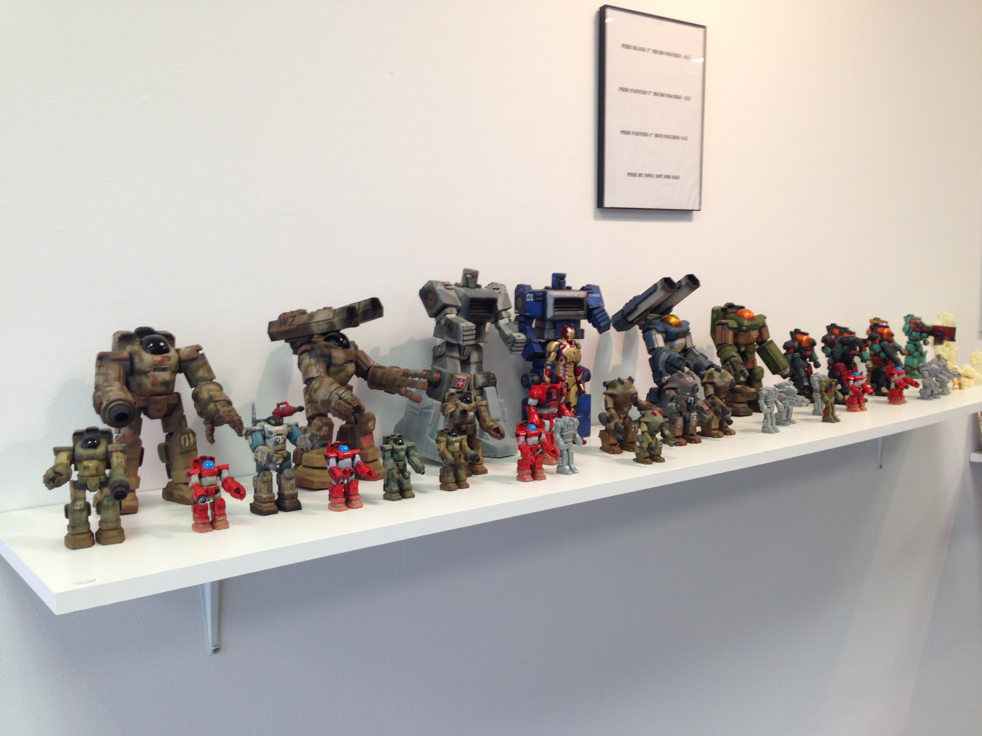 In addition to toys printed live, each of us brought a whole mess of finished toys for sale. Above is the Prometheus Rising Heavy Industries spread, with a six inch Iron Man figure that snuck in there for scale. Featured are DX Bounce Tortoises and Strike Tortoises, Mini Bounce Tortoises, Stalking Toads, and Gun Drones, Micro BTs, STs, and GDs, and some Allarounds for good measure. Oh, and those two big meaty Blockmen in the middle, not for sale but present to show off the current state of that project. I didn’t get good shots of Sanjeev and David’s spreads, but you can catch glimpses of them in all the photos above. The two of them brought some incredible heat, showing off how much could be done with different color plastics, rather than my fully painted approach. Leftovers from the show will be available soon on the Monster Kolor web shop, and I will be sure to post pics when they go live.