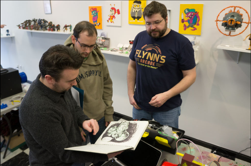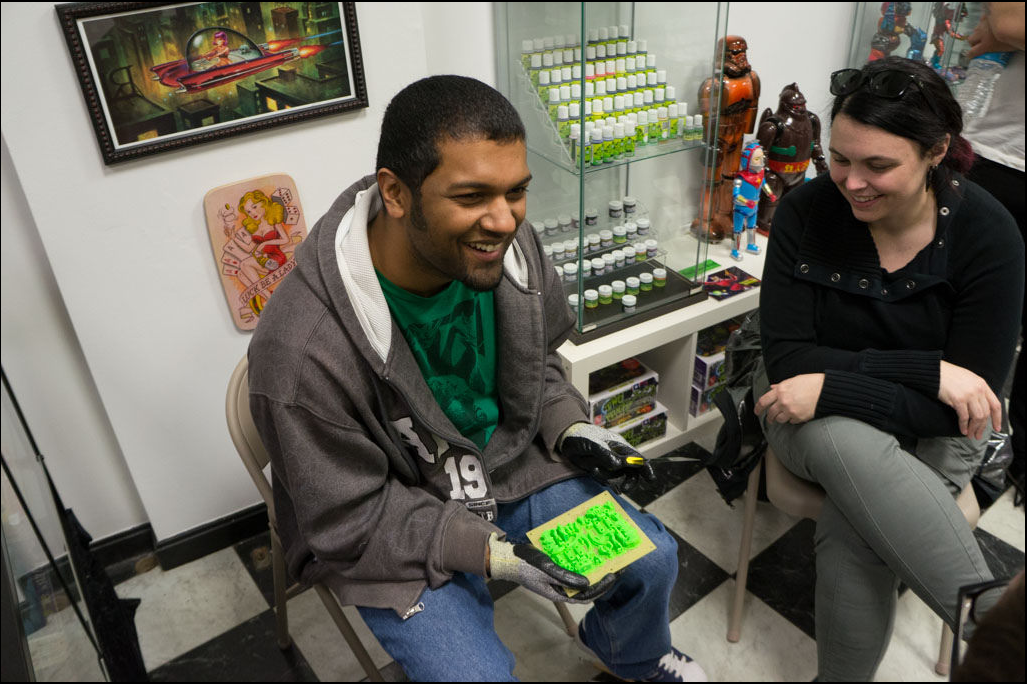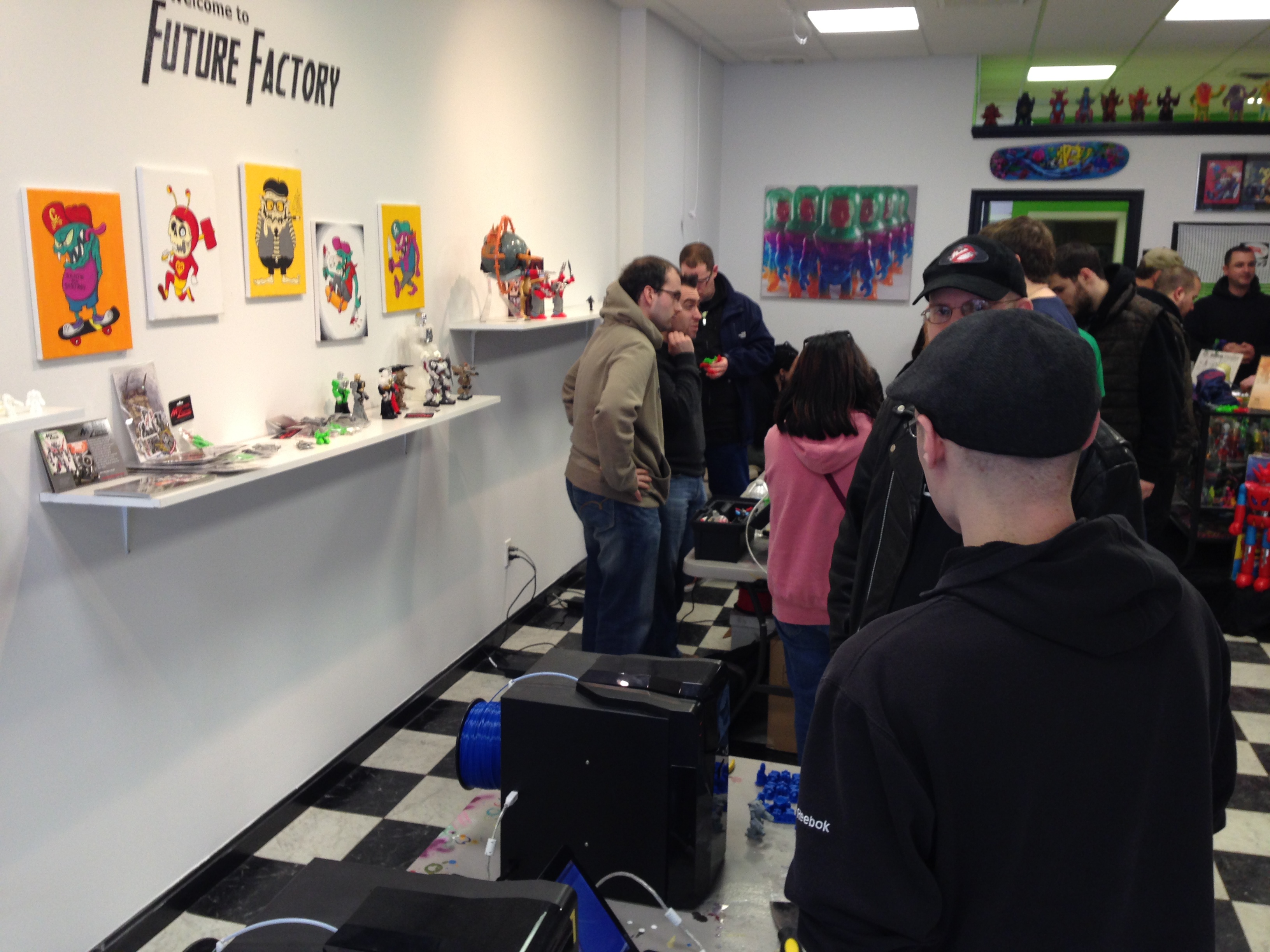 On January 25th fans of awesome homemade toys descended on the Monster Kolor shop in Middleboro, MA for the first ever Future Factory! Future Factory was a class on making toys using 3D printing hosted by Prometheus rising Studios (me), Brownnoize Productions, and Mechazone. The three of us brought our 3D printers and acetone setup to make toys live at the studio. Participants were able to chose from a stable of designs between the three of us and have the toy printed while they waited. Read on for details about what turned out to be a fantastic afternoon of toy fun!