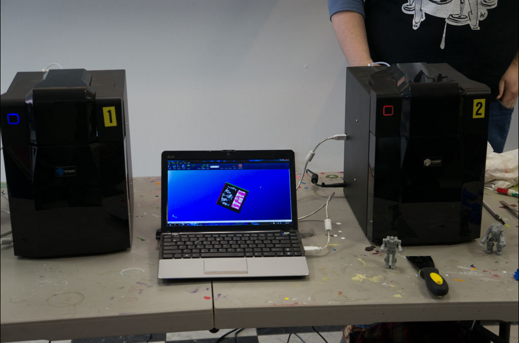 I brought my two UP Mini printers, and David and Sanjeev both brought their Afinia-H series printers. The two models are something of cousins, produced by the same manufacturers in China and sharing many components, but distributed by two different companies stateside. Everything went off without a hitch and the printers happily cranked out eight finished toys in the span of a few short hours.