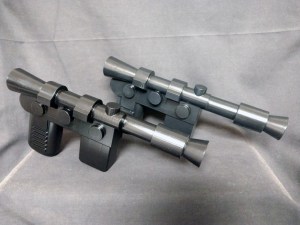 The nice thing about having a set of 3D model files drawn up for something is that the files can be scaled to any size you want, and printed out. Some adjustments were needed, but once I had my models ready for my PRHI Kenner Star Wars Accessories, I was able to print the same designs out, but at lifesize! Kenner’s Star Wars weapon sculpts are iconic amongst vintage toys, with a level of detail and charm informed by how those early toys came to be. They are immediately recognizable as representative of what we saw in the films, but they are an interpretation with their own merits. As such, it turns out that they make really satisfying lifesize toys, with chunky details and familiar shapes. So far I’ve completed two of the first weapons made, the smuggler pistol and imperial blaster rifle, as well as the later-made lightsaber, and my personal favorite, the Bespin blaster. I am working through more of the catalog and will post pics when they’re completed! Now I just need to figure out how to display them.