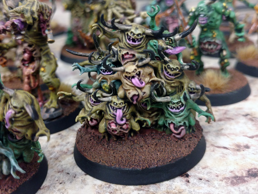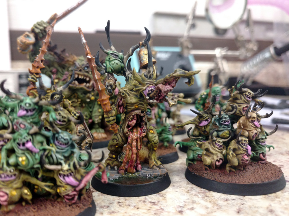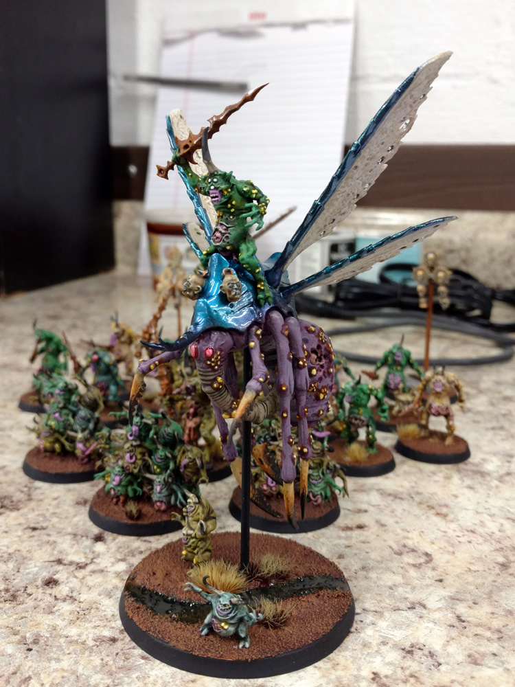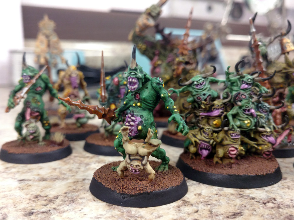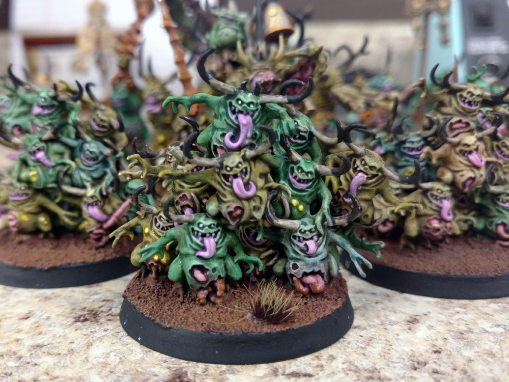 Nurgle Daemons are the heralds and embodiment of death and decay, spreading pestilence wherever they tread. They are gross and grimy, which makes for very fun painting. Most of these were done quick and easy with lots of washes over a light, drybrushed basecoat. For a little extra fun, I painted the carapaces of the fly daemons with Monster Kolor paints and left them with a high-gloss finish. It gives them a little extra insect authenticity.