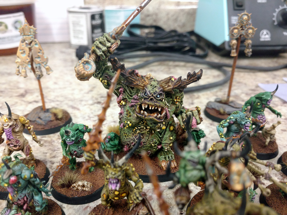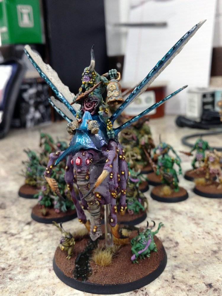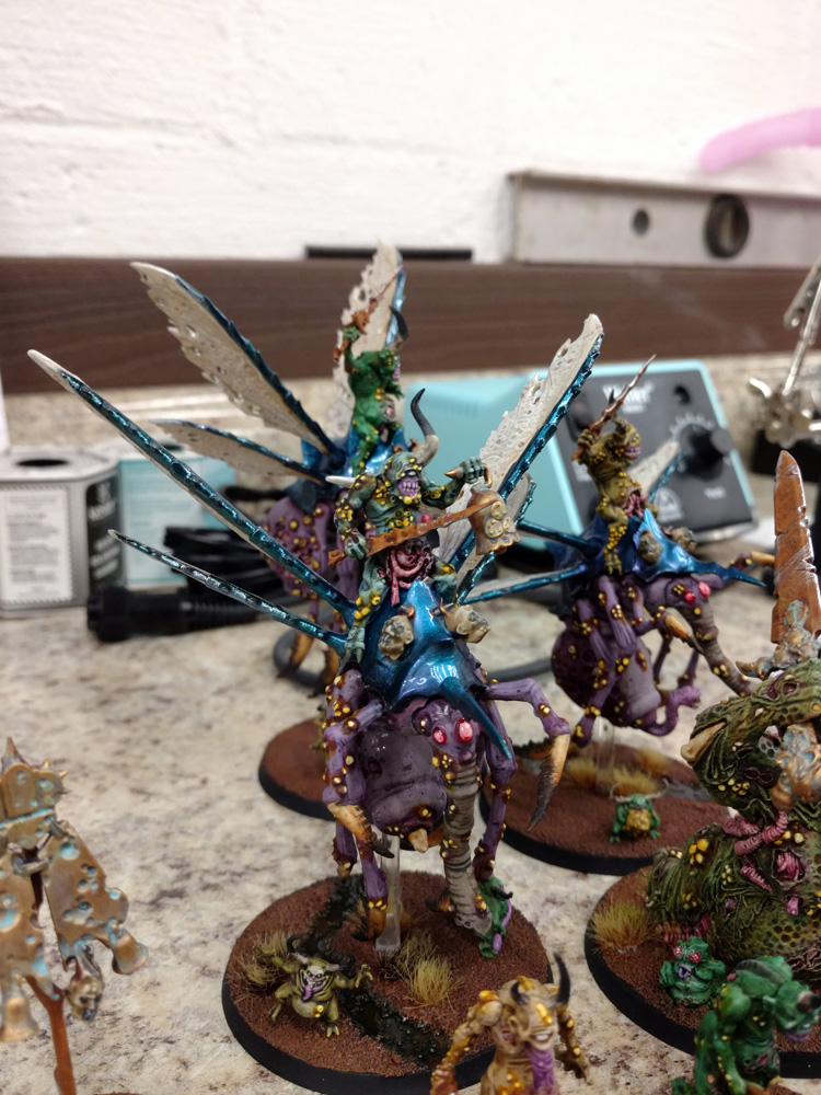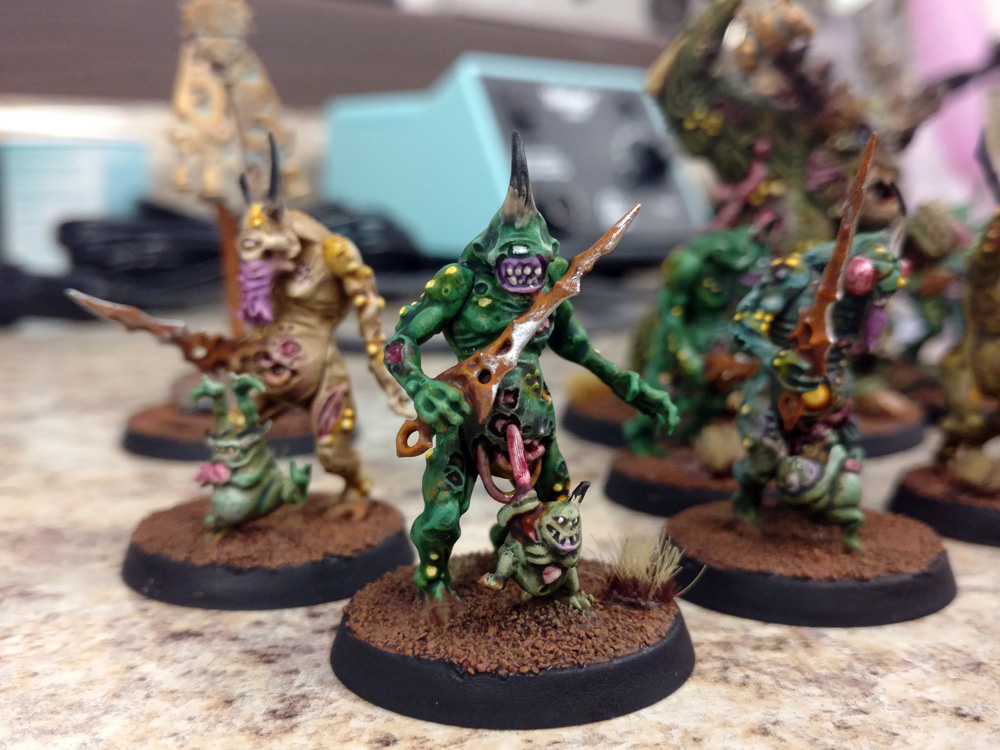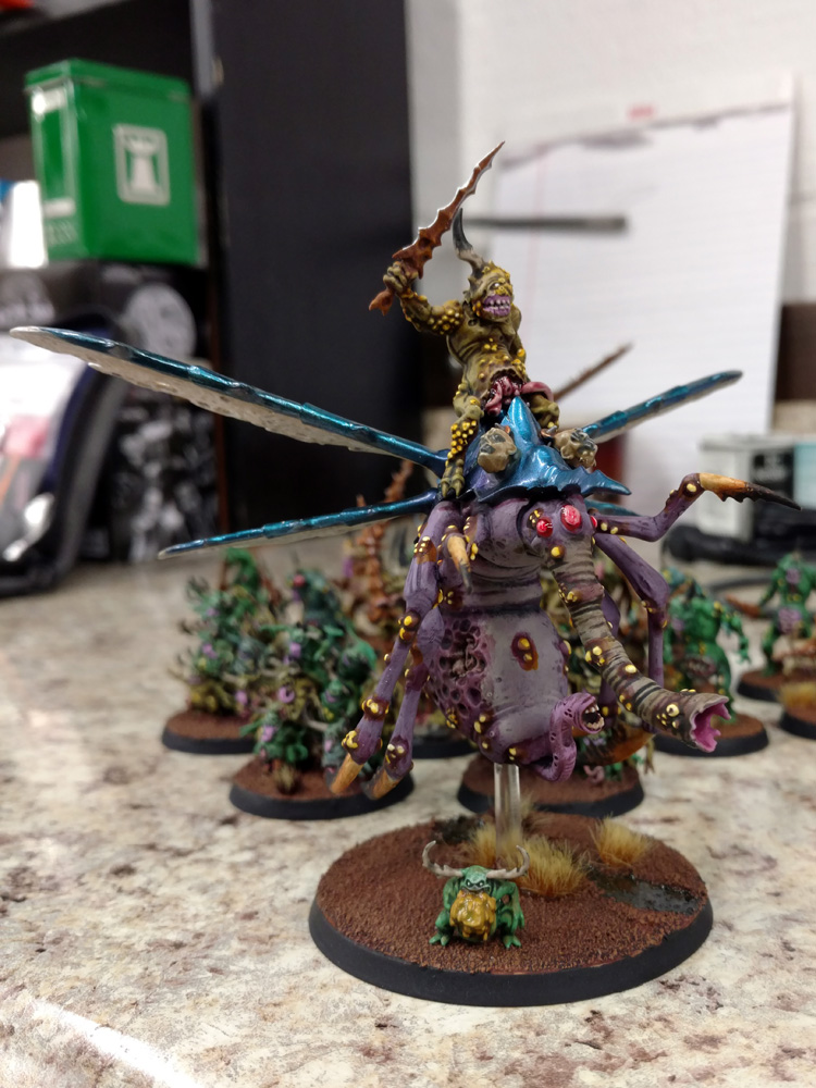 Nurgle Daemons are the heralds and embodiment of death and decay, spreading pestilence wherever they tread. They are gross and grimy, which makes for very fun painting. Most of these were done quick and easy with lots of washes over a light, drybrushed basecoat. For a little extra fun, I painted the carapaces of the fly daemons with Monster Kolor paints and left them with a high-gloss finish. It gives them a little extra insect authenticity.