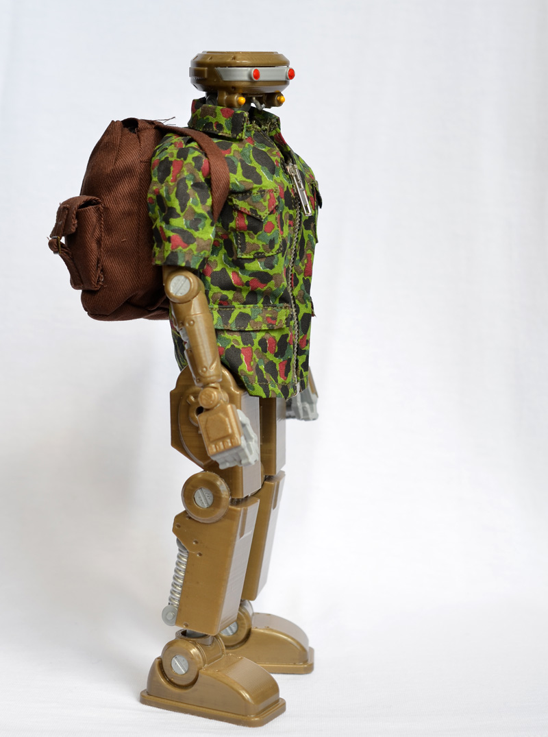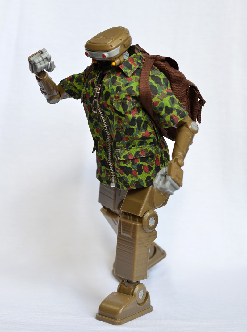 MH-01 was the first completed test of the revised design. Machine Heart takes inspiration from Honda’s ASIMO robot and 70’s Takara SFLand robot design, as well as NASA’s Valkyrie robot astronaut. MH was designed to scale with vintage-style GI Joe and Elite Brigade toys, to the point that the figure can wear GI Joe outerwear and accessories. He even fits into GI Joe vehicles!