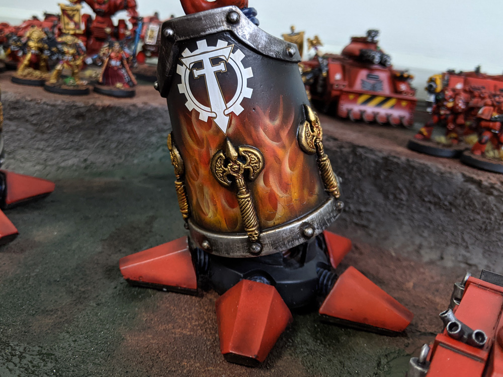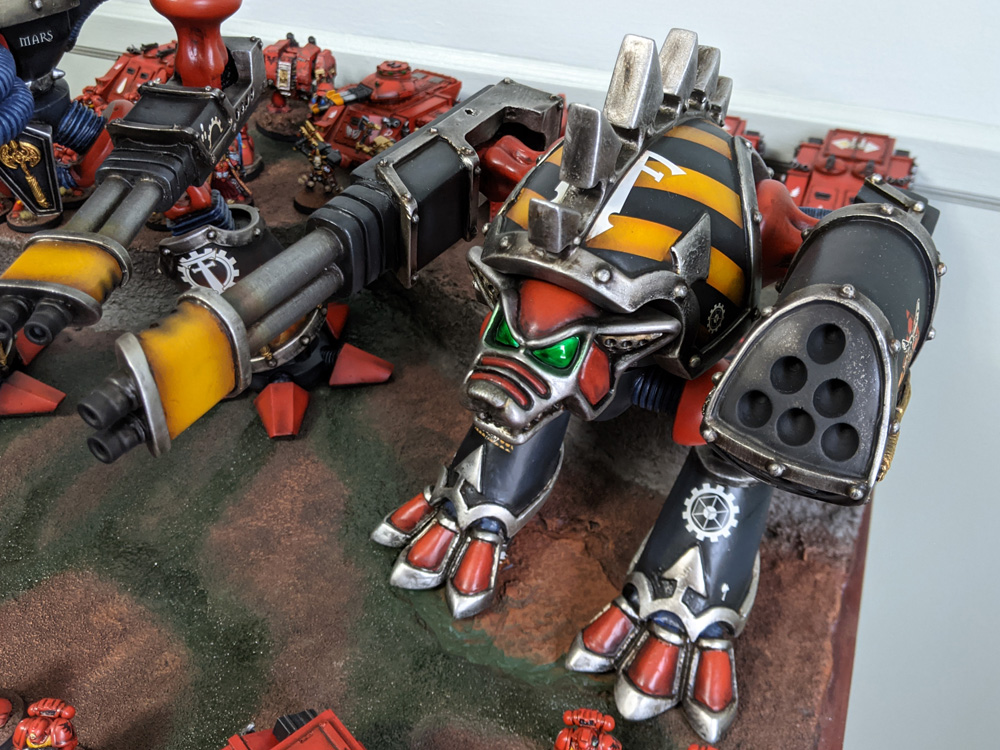 I’ve spent the second half of 2020 quarantine steeping myself in classic 2nd Edition Warhammer 40k. There’s been a big revival of interest in Oldhammer in the last few years, both on the 40k and Fantasy sides. The books and artwork are incredible, the models are fun to collect, and the paint schemes are delightful. I’ve been pouring over vintage White Dwarf magazines for inspiration and history lessons, loving every second of it. My 2E Blood Angels Space Marine 3rd Company is about half done, and will get plenty of its own coverage when it’s ready. To back them up, I managed to get my hands on a couple of my biggest grail vintage kits, the Armorcast Titans! I’ve lusted after these models since probably the seventh grade and they’ve always been prohibitively expensive and rare after those days. I managed to snag a couple earlier this year and took my time with them, sanding and puttying and cleaning them up for paint. It took a bit to decide what Legion scheme to go with, but I settled on the classic Fire Wasps style that was in so much of the original Titan Legions and Adeptus Titanicus artwork of the era. I already have a modern-style Warlord in the Legio Astorum scheme (posted on Instagram but never properly photographed for the site) and I wanted to differentiate between the modern style and retro machines.