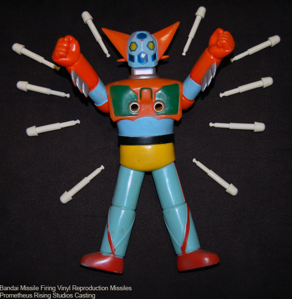 There’s a new Page in the Menu bar at the top of the site, and I am proud to announce a new resin product that will soon be available, reproduction Bandai Missile Firing Vinyl missiles! The Bandai MFVs are some of the most iconic vintage Super Robot vinyls, but missiles are in great demand (mostly because these were toys designed for children, and those children probably spent all their time shooting the missiles at their younger siblings and pets until they lost the missiles), but I am pleased to soon be able to offer an affordable reproduction missile! Big thanks to my friend Sanjeev (mastermind behind Brownnoize Productions) for lending me some vintage missiles, no mean feat! I am figuring out pricing and ordering, as well as working on some stock, so check back for details soon!