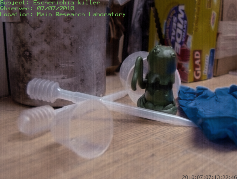 The unbelievable heat here in New York has just about everything at a standstill, so painting the first wave has been pushed back. Unfortunately, there was an accident in the lab, and the one killer that received a base coat so I could show off the sculpt escaped, leaving a path of destruction behind. Attached are the last photos of the specimen, taken by the late guard on duty at the time: