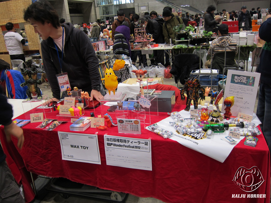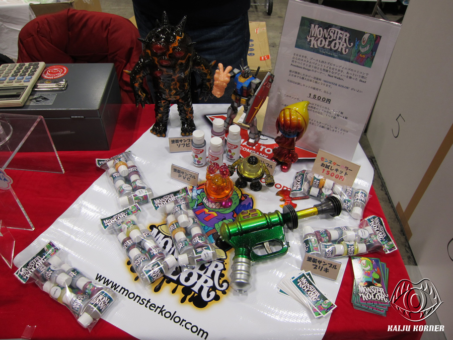 When I posted the finished shots of my Master Grade RX-78-2 Gundam painted with Monster Kolor, Matt Walker aka Dead Pre$idents asked me if he could display it at the booth he was sharing with Max Toy Co at Winter Wonder Festival in Japan. Monster Kolor paint has been a huge success for Matt, and he is always looking for demonstrations of its use in new and creative ways. My MK on plastic Gundam model fit the bill, and was shipped off to Japan for display at the show. These pics of the booth come courtesy of Kaiju Korner Andy, who has been providing the best English-language coverage of Japanese shows and festivals out there for a couple of years now. Go check out the rest of his extensive WonderFest coverage here. He took a gazillion photos, and there’s more still to be posted.