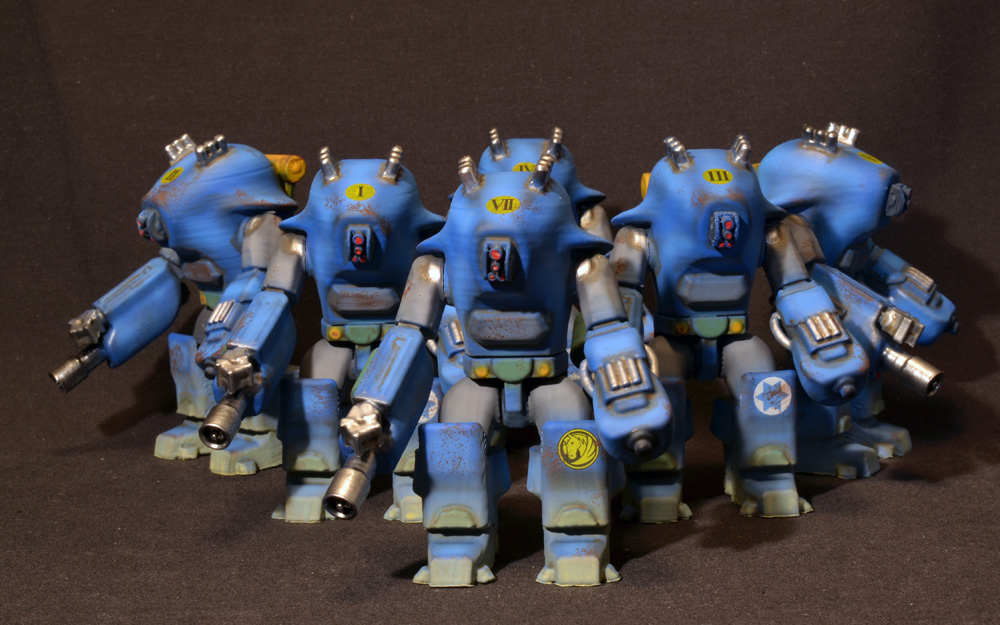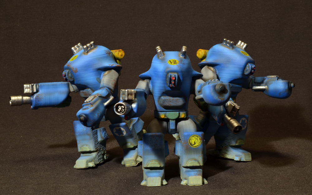These anime-inspired Stalking Toads made their debut at Super Robot Giant Monster. My goal for these was to invoke some more traditional mecha anime colors, rounded out with a lighter weathering than normal so as not to overpower the color scheme. I finished them off with a few glossy Monster Kolor silver weapon details that mimic the chrome bits on classic Japanese robot toys.