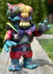 Also tried out taking photos in the sun today, instead of fighting with indoor fluorescent lighting, so there’s a couple extra shots of the Jet Jaguar, and the three shiniest figures I own. The red one is a Dead Presidents painted RxH Adult Fly Guy from a show a few months back. I have one more DP figure, but he was tucked away on the shelf, and I’ve got another one coming! I love the unique way Dead Presidents works so many colors and loose sprays into his figures. I like to focus on painting all the elements of the sculpt, but DP just works on a whole different level to lay down his colors, and it mystifies me while looking real good.