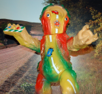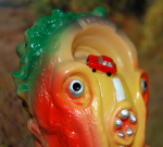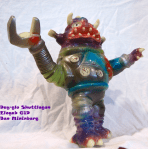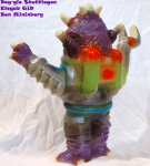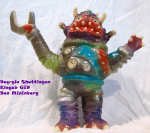 Elegab is the work of a single man in Japan, and is cranking out some of the most original vinyl kaiju available right now. All of Elegab’s stuff has a rougher hand-made feel, and the figures never sacrifice on the fun factor. The Shuttlegon here is a towering monster held into some kind of containment suit with a jetpack and mechanical wrench-arm that can grab and hold mini figures! This custom is painted on the Glow In the Dark blank that was released a few months ago… I also have a blank Monster Patrol Car (another amazing toy) to paint up some day. I wanted to try using more colors than I usually do, and used a shiny finish instead of my usual matte. The metallic bits are all Future shiny and look like candy, and all of the organic bits were hit with a 50/50 Future and Vallejo Satin mix. The eyes were painted to match the production Elegab pieces with a thick and rough white and black combo. The horns and claws and teeth are all the base GID vinyl, and the whole figure still glows really well through the paint. Glow shots to come tonight.