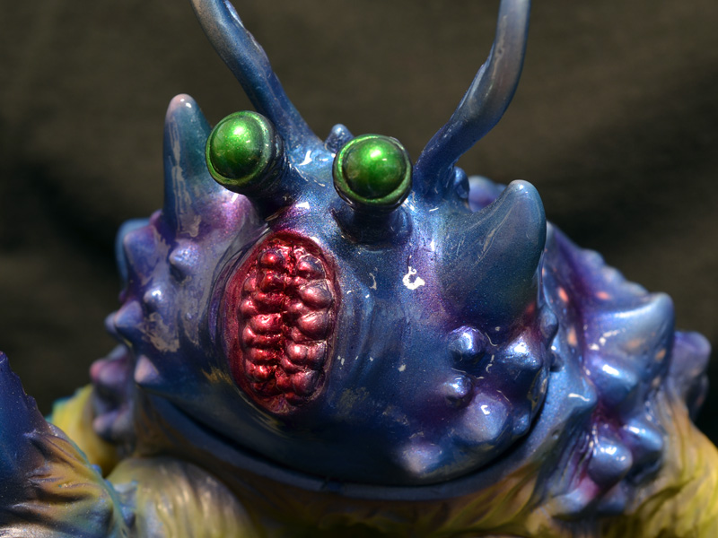 Bemlar has the dubious distinction of being the first Ultra Monster to face an Ultraman, way back in 1966. It’s a solid design that still holds up, and M1’s sculpt is a great representation, capturing Bemlar’s weird upright stance with just the right amount of stylization. The toy is covered with terrific textures that made painting this guy a blast. I painted Bemlar at the last Monster Kolor paint class, where I had access to the full host of MK goodies. I had just come back from seeing Godzilla 2014 the night before, which is incredible and everyone should see. I was really smitten by how hard it was to figure out what color Goji was in that film, so I wanted to try something like that for myself. I used a lot of strong directional sprays, a couple of metallic colors, clear colors, and some final pearl work to make Bemlar look a different color from pretty much every direction. I tried to capture that in the photos by taking shots from different angles. He’s blue in some, green in others, with yellow and copper hues showing up as well. Painted on flesh vinyl visible on the arms.