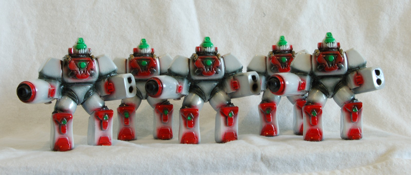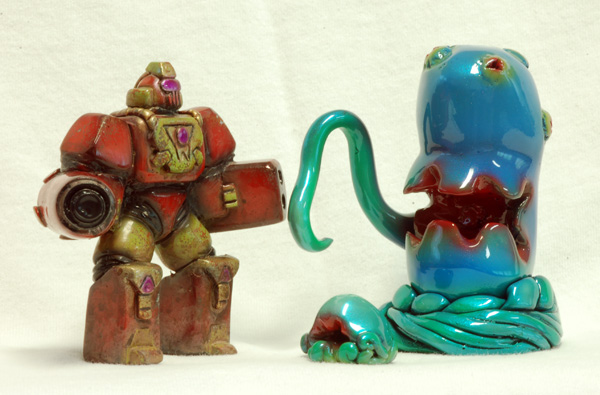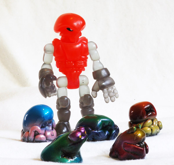 This set was made for an Open Call Judged Resin show at Toy Art Gallery, opening this Friday, June 10. The set features a prototype-colored ‘X-gal’ E. killer, a weathered, down and dirty Safrinin Microfighter, and a bonus S. muderious magnetic mini macro-culture.