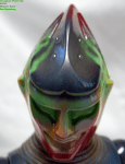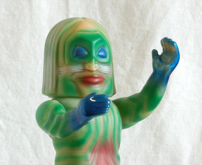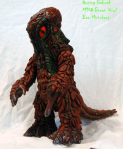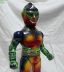 Bemlar has the dubious distinction of being the first Ultra Monster to face an Ultraman, way back in 1966. It’s a solid design that still holds up, and M1’s sculpt is a great representation, capturing Bemlar’s weird upright stance with just the right amount of stylization. The toy is covered with terrific textures that made painting this guy a blast. I painted Bemlar at the last Monster Kolor paint class, where I had access to the full host of MK goodies. I had just come back from seeing Godzilla 2014 the night before, which is incredible and everyone should see. I was really smitten by how hard it was to figure out what color Goji was in that film, so I wanted to try something like that for myself. I used a lot of strong directional sprays, a couple of metallic colors, clear colors, and some final pearl work to make Bemlar look a different color from pretty much every direction. I tried to capture that in the photos by taking shots from different angles. He’s blue in some, green in others, with yellow and copper hues showing up as well. Painted on flesh vinyl visible on the arms.
