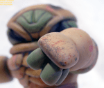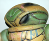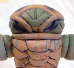 Finished the Desert Armodoc today! He’s been on the trail of a traveler for what seems like eons, both of them trapped on a world of endless desert. The Armodoc’s been blasted by winds and scorched by suns, and caked with dust. I left the eyes, gun tip, and top head ‘vents’ GID vinyl to add a little interest, and the color of the glow vinyl fits right in with the desert faded colors. The weathering is a combination of oil washes, filters, acrylic chipping, airbrushed paint fading, and dry pigments, all done in layers to give him some history and depth.