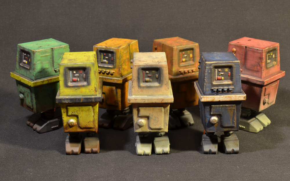 My 3D printed Gonk Droids have been a popular item since I posted the first one in 1/6 scale and sent one to Tested.com as fan mail. The 1/6 scale ones take a tremendous amount of time to produce, but I still wanted to come up with a way for folks to add a 3D printed, heavily weathered little Gonk to their collection. A friend of mine suggested I go with 1/12 scale (6″) instead, as has been popularized recently with the Star Wars Black 6″ collection. I’m a big fan of the scale myself from collecting Marvel and 3A Portable figures, so it was an easy fit. I had to make a few tweaks to the legs to make the ball joints more durable in the smaller scale, but for the most part I was able to scale my existing model files down by 50% in the printer software without any problem. After some acetone treatment, Monster Kolor, and a healthy dose of weathering using acrylics, the first batch of 6″ scale Gonk Droids are ready to go. To celebrate the first sale of 2015, the Gonk Droids will also be the inaugural release on the new PRS Store site on Storenvy! Head on over to PRSStore.Storenvy.com at 8PM EST on Saturday, January 17th to pick up a Gonk Droid for $50 plus shipping.