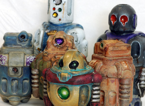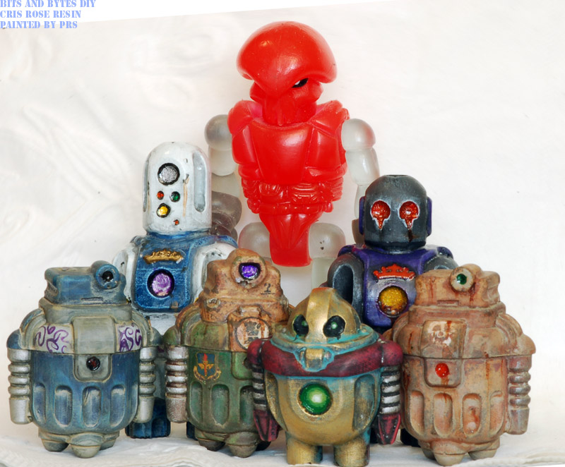 Cris Rose is a UK-based artist that is into analog photography and robots. His resin robots are functional, yet cute. There are back stories to all of his designs. Cris imagines a world where robots are ubiquitous servants, everywhere from industrial labor to childcare. I had a great time painting up a pack of his recent Bits and Bytes mini-sized (1/24 scale) DIY ‘bots, each with their own background. Keep in mind each of these minis is around an inch tall, and check after the fold for pics of each!