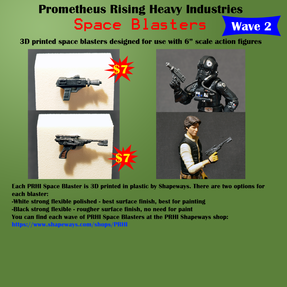 I’ve got some new items up in the PRHI Shapeways Shop, the first wave of Space Blasters! The first batch of blasters are all things that I have received multiple requests for from Star Wars collectors. Two are a set of blasters designed for use with the Star Wars Black 6″ Boba Fett Prototype version, based on photos and video of the early character design. The other is a pistol for use by your SWB6″ Imperials. Each is available in two materials on Shapeways, White Strong Flexible Polished, and Black Strong Flexible. The WSF Polished versions have the best surface finish, and are better for painting (as seen in the promo pic above). The BSF option is for folks that don’t want to paint their guns and they come dyed black from Shapeways, but are not offered with a polished finish. Head on over to the PRHI Shapeways Shop to buy some space blasters at the link below: